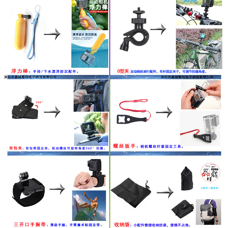 主营产品:运动相机手机配件,Gopro配件,手机吸盘支架,车载支架、