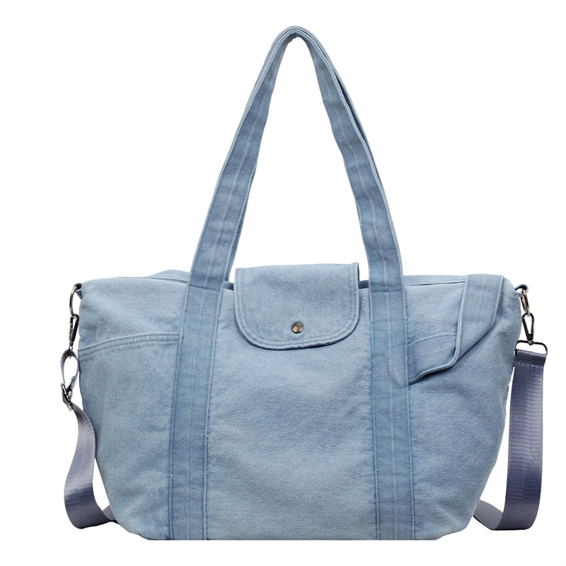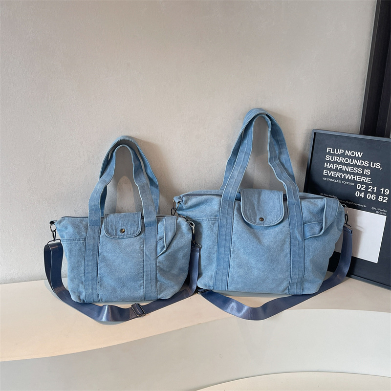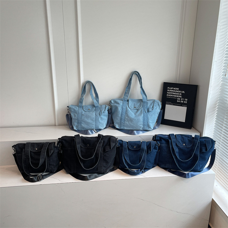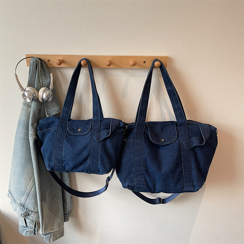 新款大容量纯色牛仔布托特包时尚日系百搭单肩包通勤复古帆布包女