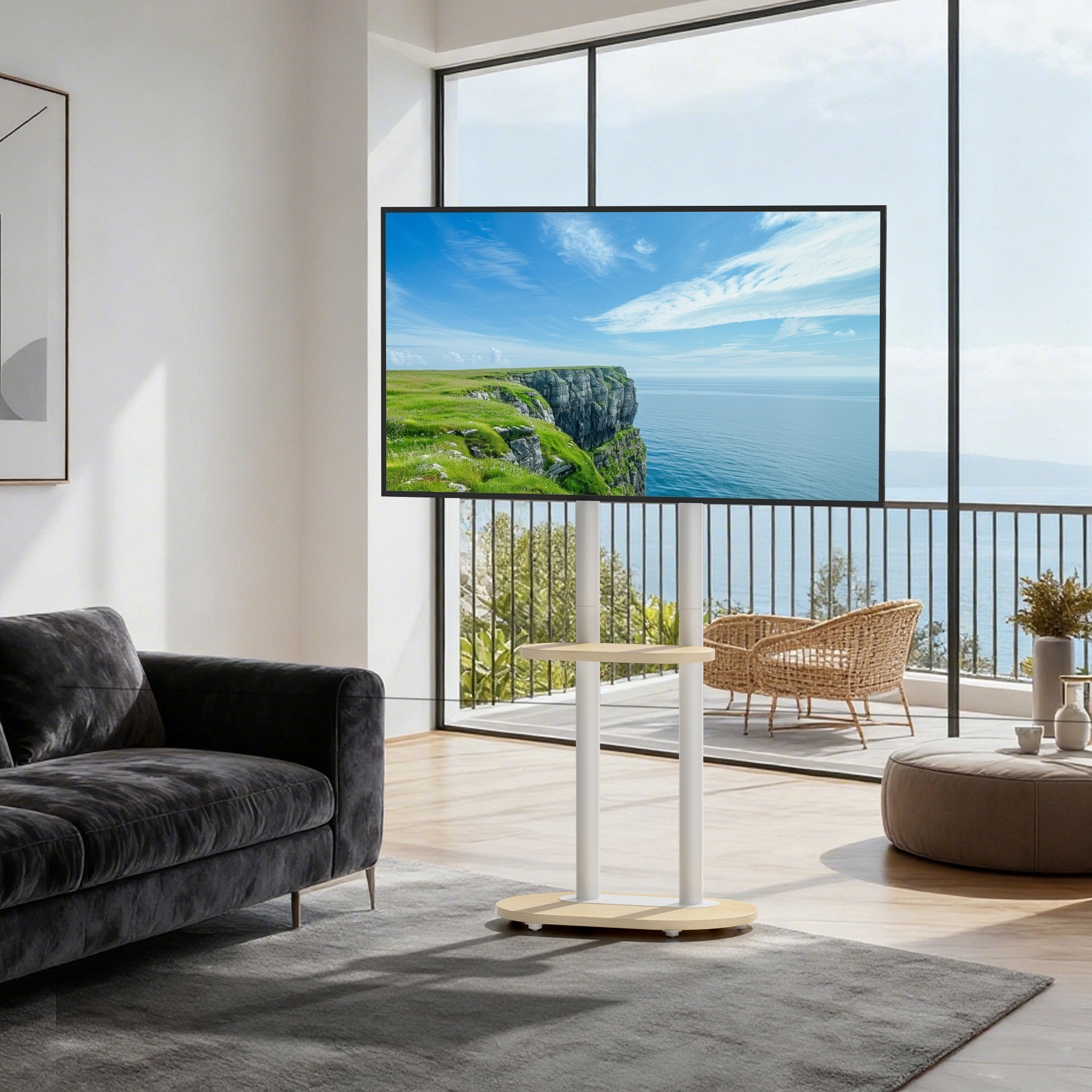 UNHO双杆落地电视支架可移动 升降电视架落地式带轮 办公直播支架