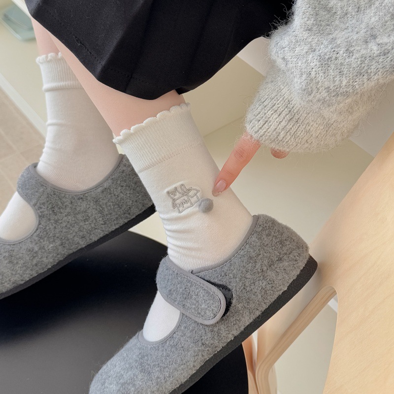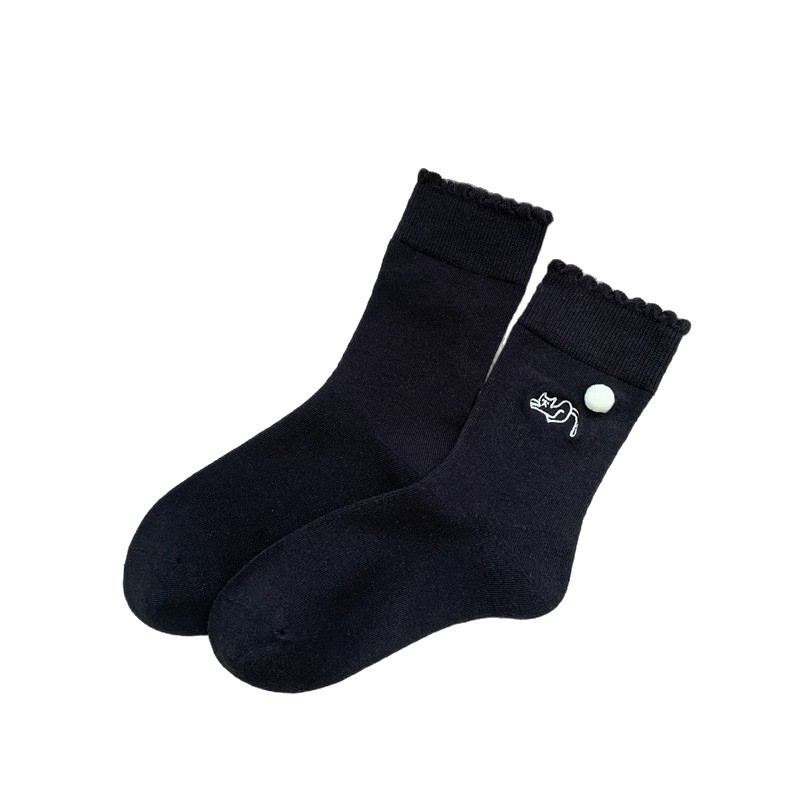 卡通猫咪刺绣中筒袜女立体毛球可爱花边堆堆袜日系风百搭少女棉袜