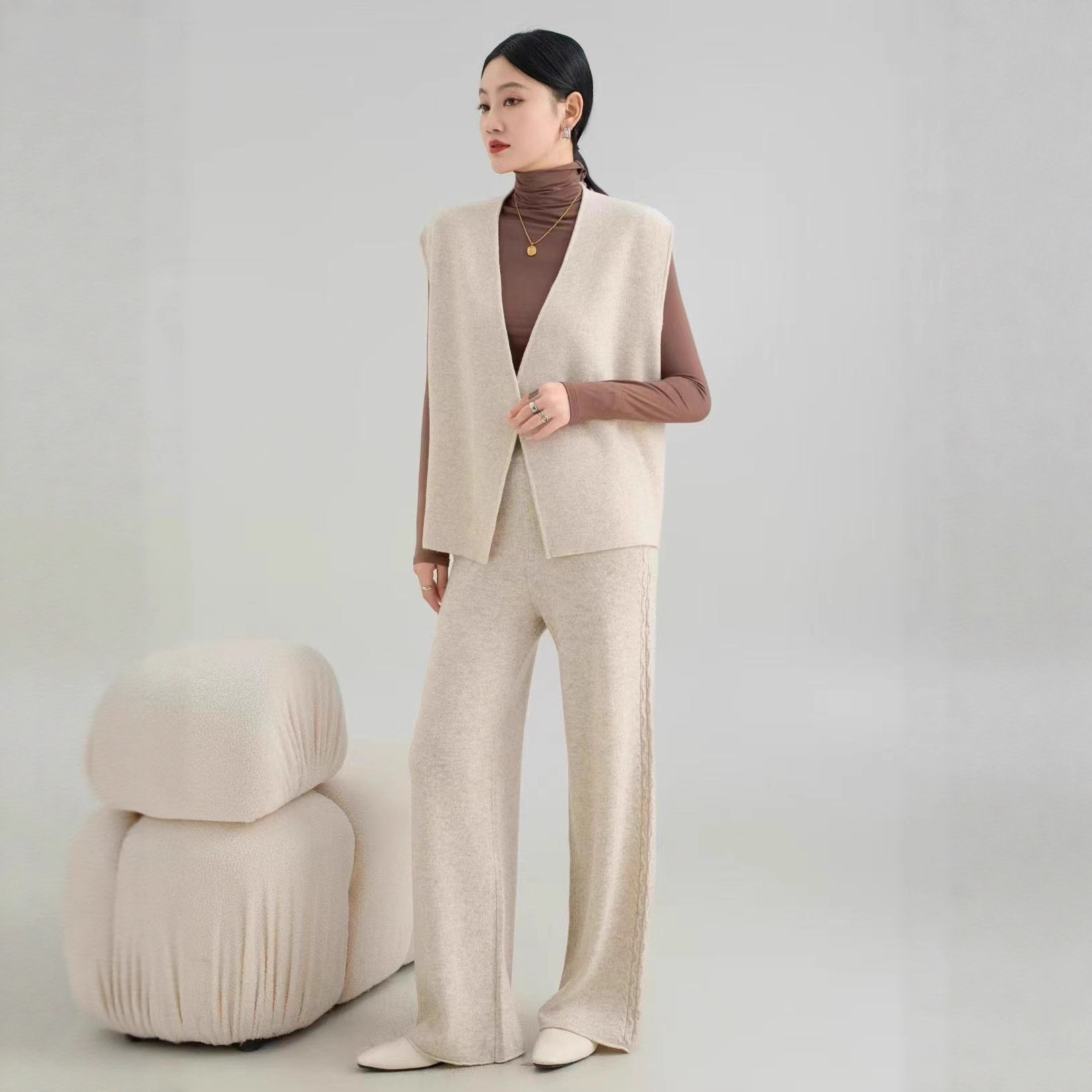 100%羊毛针织套装女新款高领毛针织衫上衣慵懒马甲裤子全毛两件套