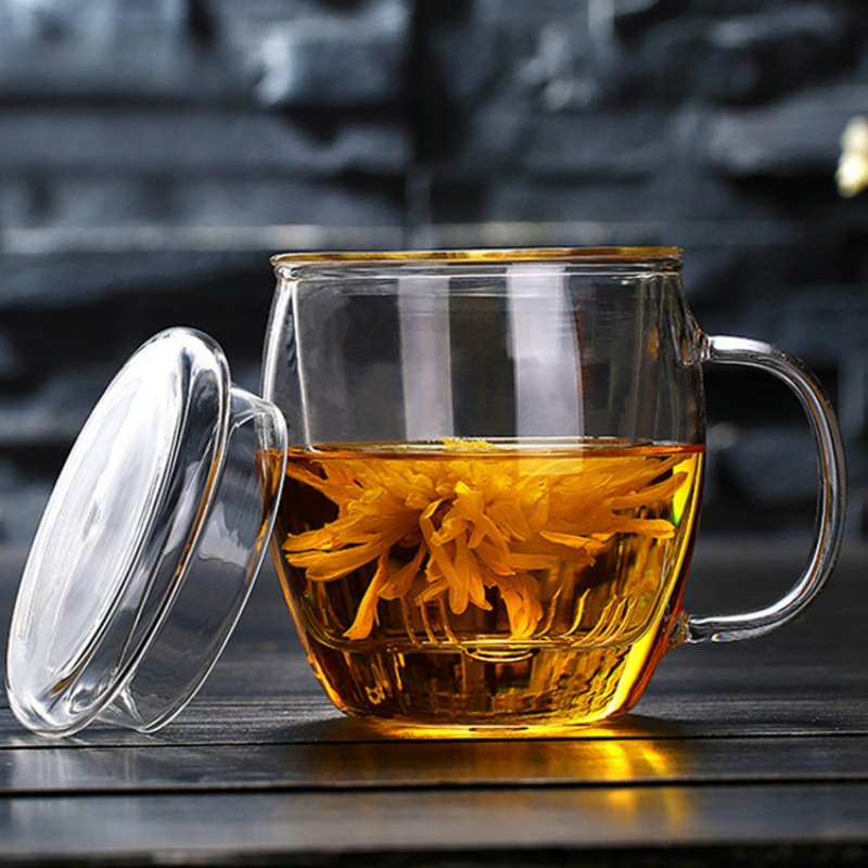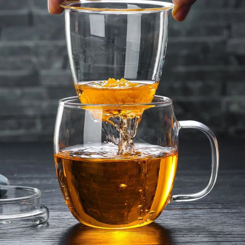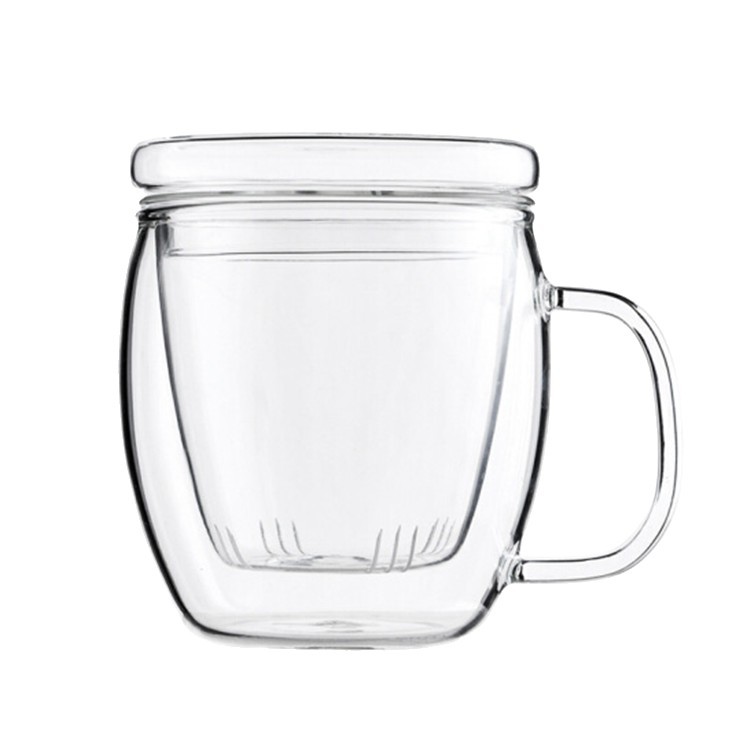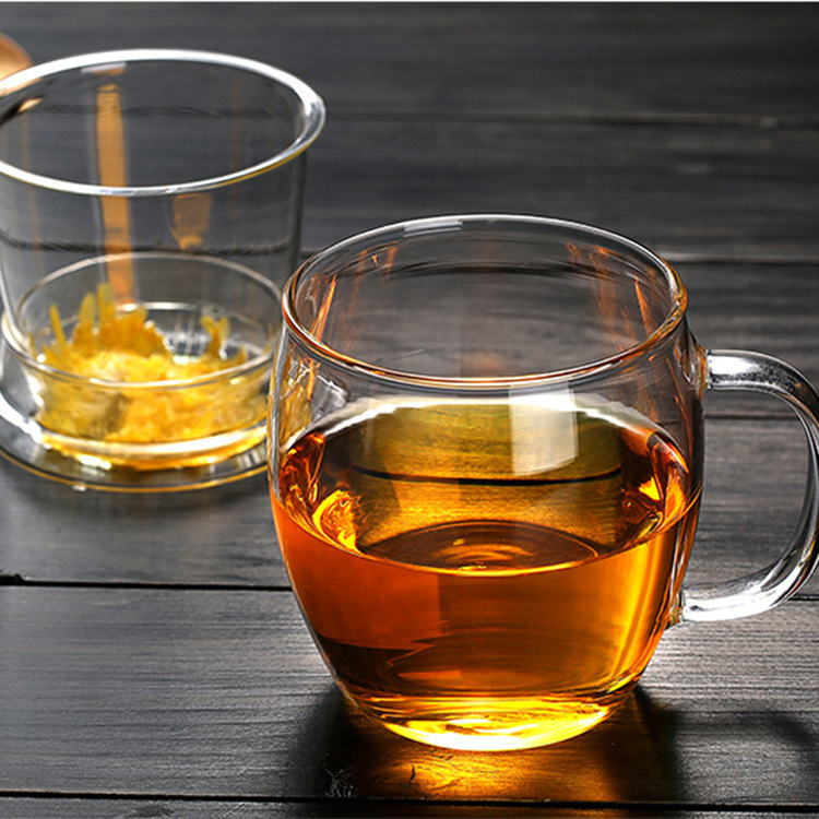 透明带盖腰鼓杯 高硼硅玻璃简约加厚三件杯 办公室茶水分离泡茶杯