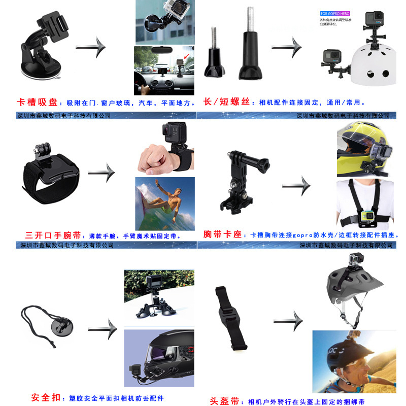 主营产品:运动相机手机配件,Gopro配件,手机吸盘支架,车载支架、