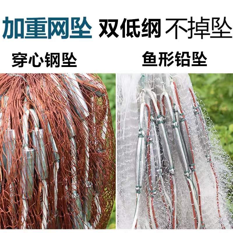 | 颜色 | 白尼龙 半指3.5米高8斤直径5米 鱼形铅坠 | 颜色 | 鱼线0.2指3.5米高8斤直径4.5米 穿心钢坠 |