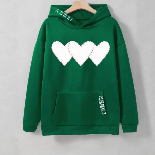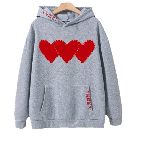 2025外贸女式加绒卫衣 素色心形印花 袋鼠口袋抽绳印花连帽衫批发