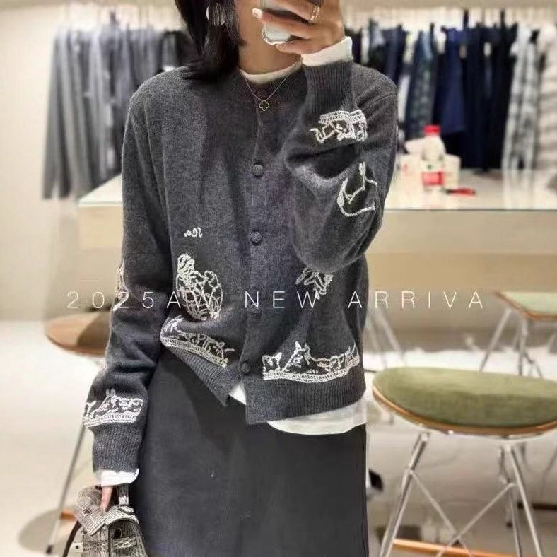 2025秋冬新款格雷色系欧货图案重工刺绣拼蕾丝全羊毛针织圆领开衫