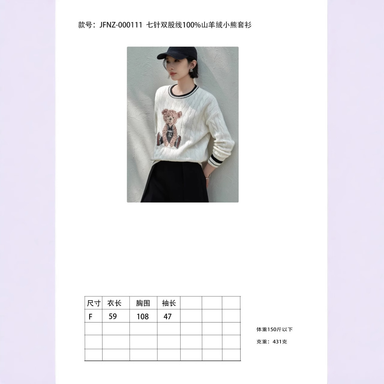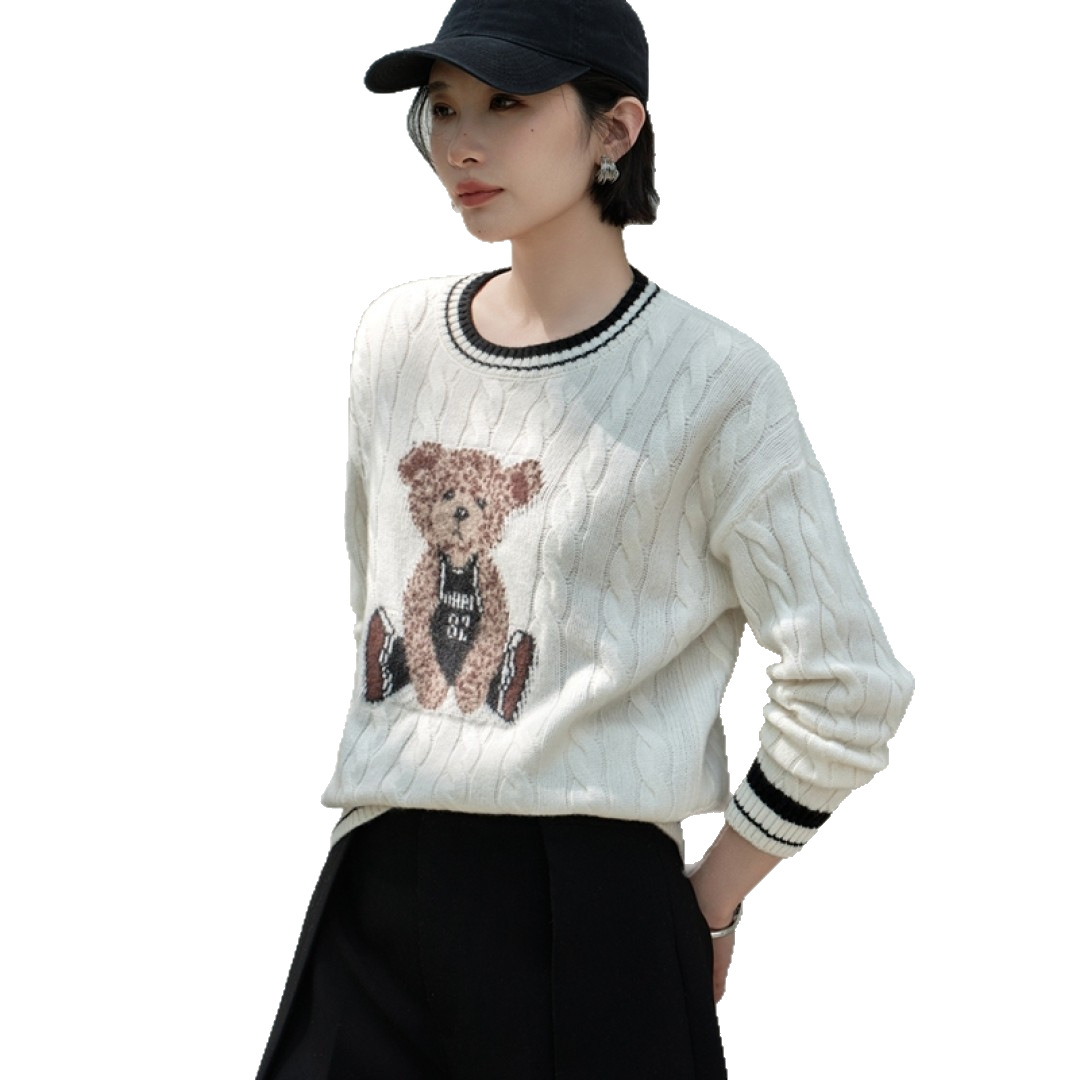 秋冬100%纯山羊绒衫女加厚圆领毛衣宽松小熊刺绣针织打底卡通减龄