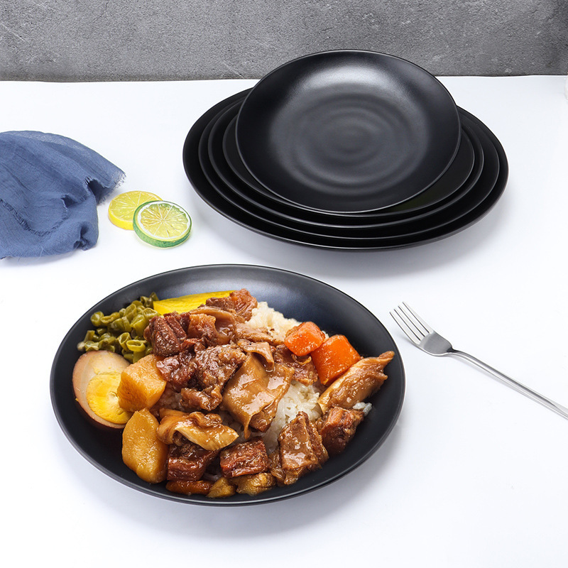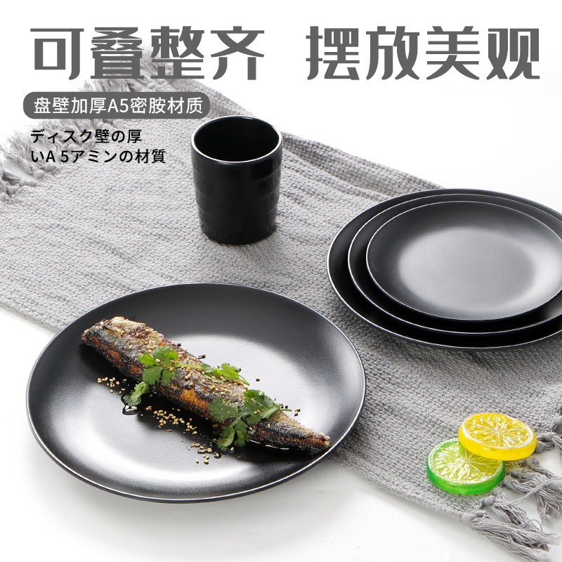 密胺黑色磨砂圆盘火锅烧烤餐厅炒菜盘骨碟仿瓷餐具配菜盘商用平盘
