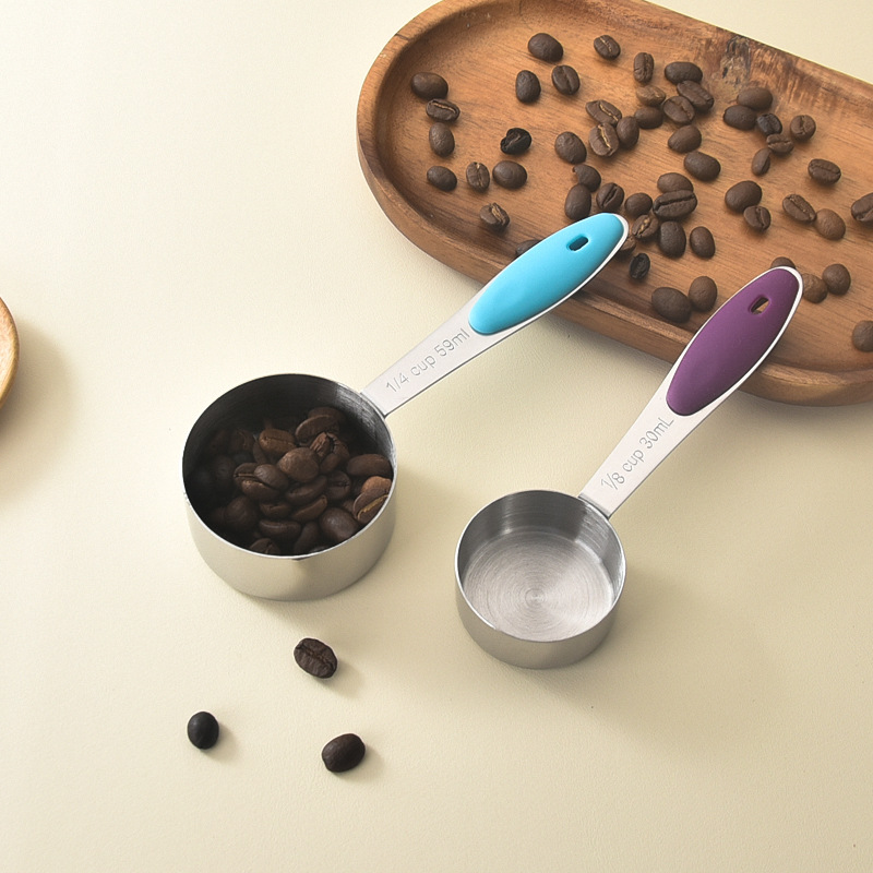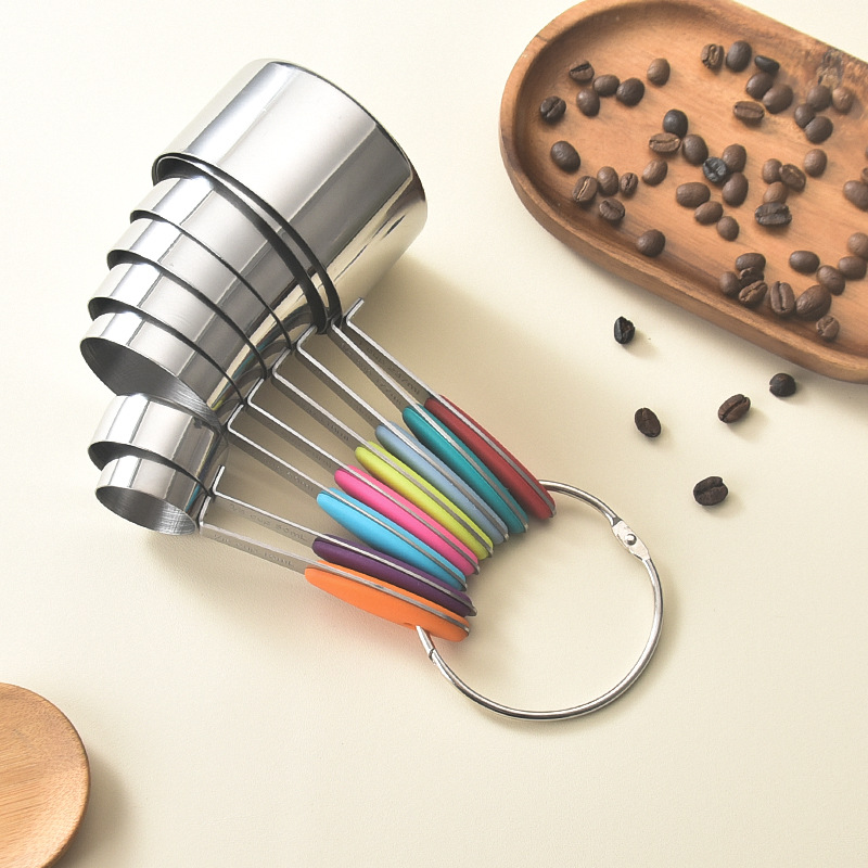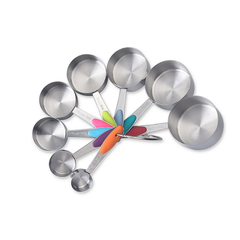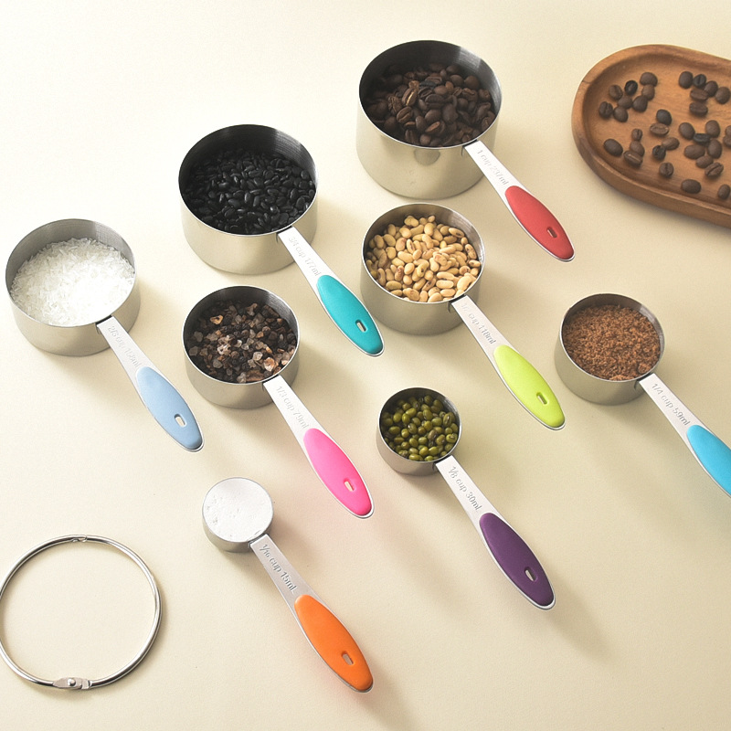 跨境不锈钢彩色硅胶柄量杯勺子8件套装 厨房精准刻度烘培计量工具