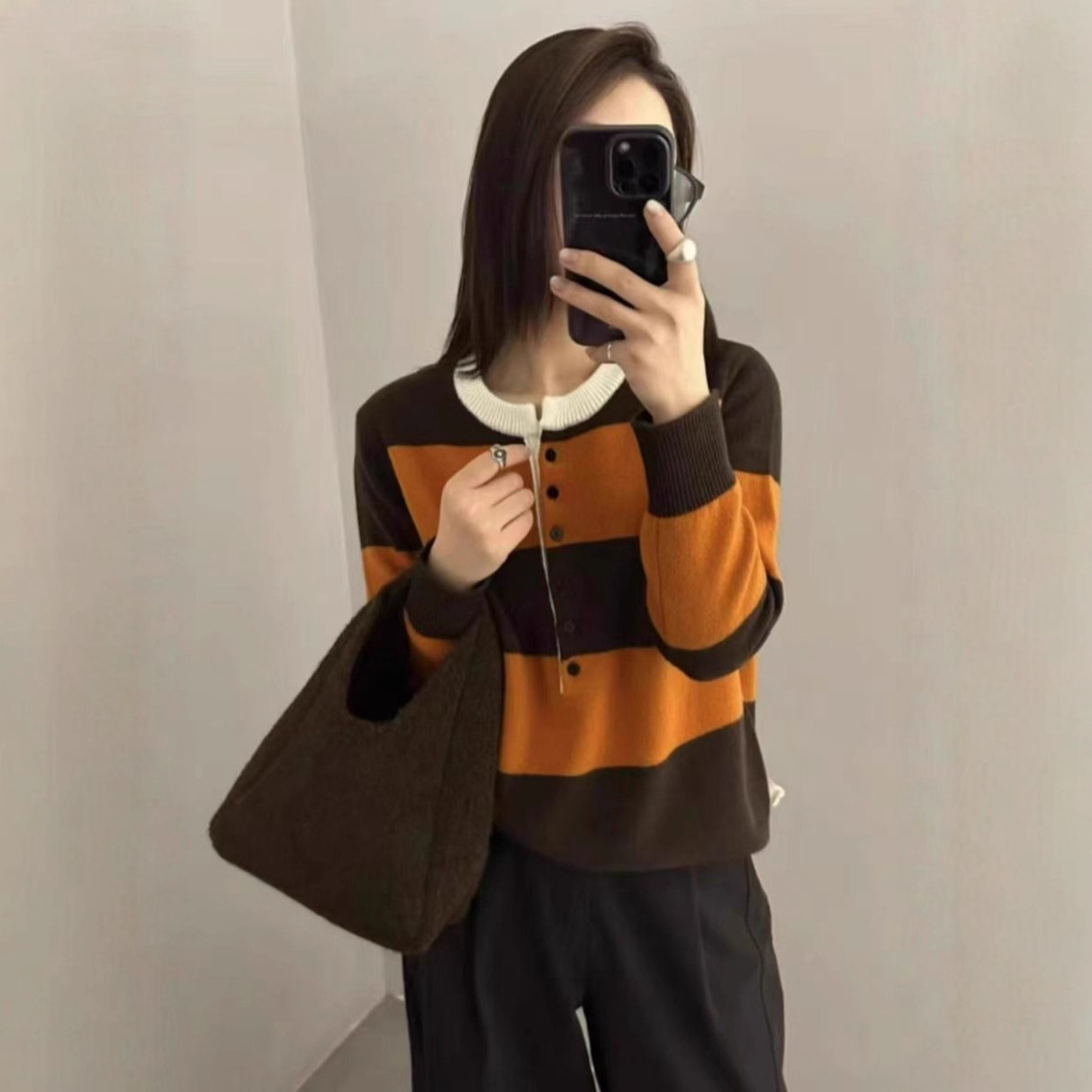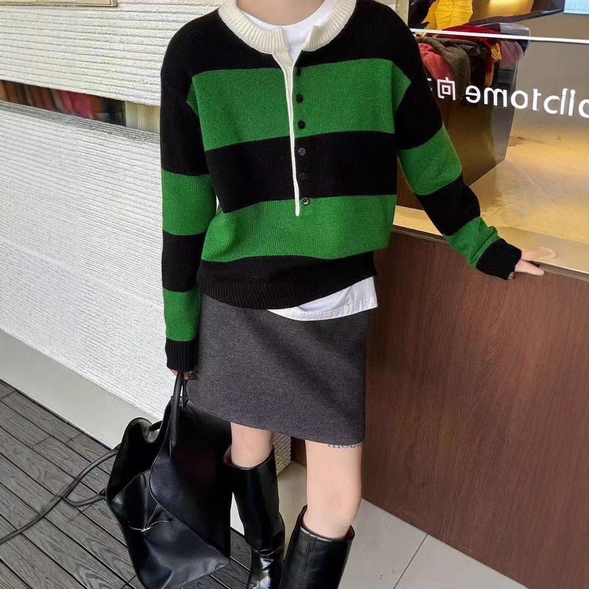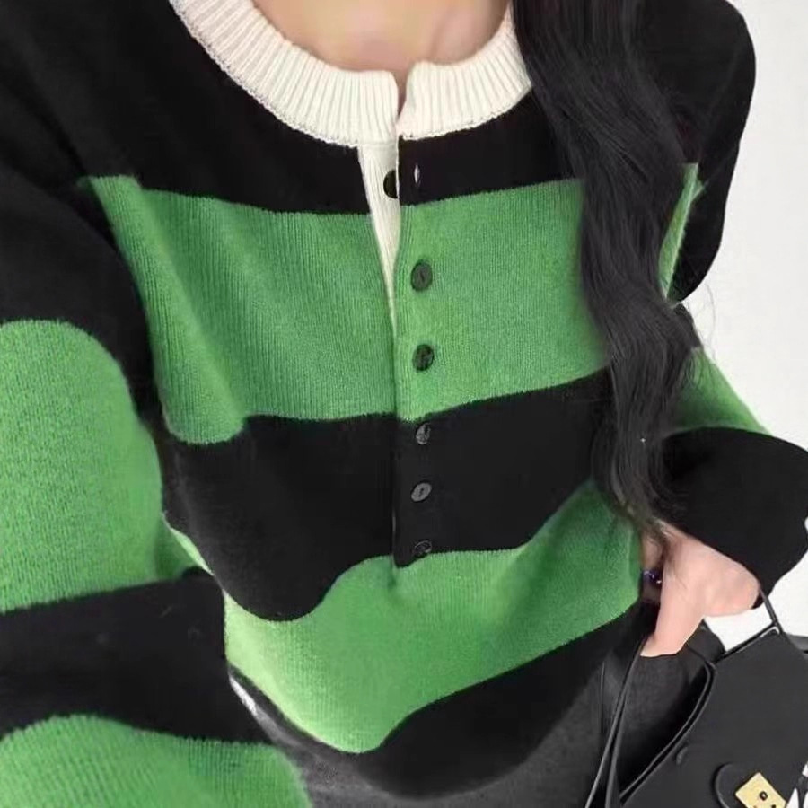 100%羊毛针织衫女时尚百搭圆领长袖半开扣秋季设计感条纹毛衣女潮
