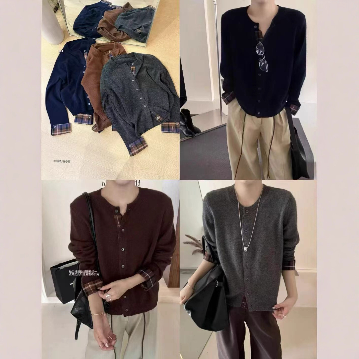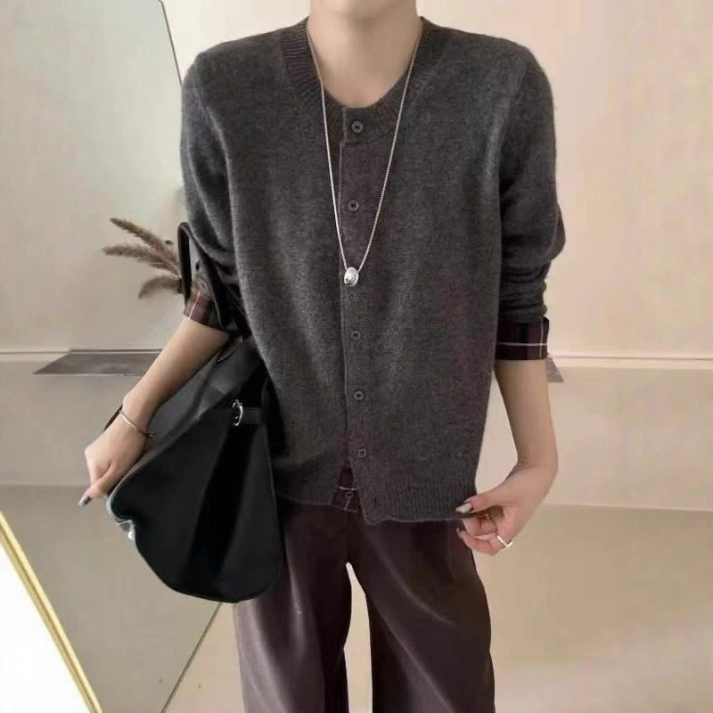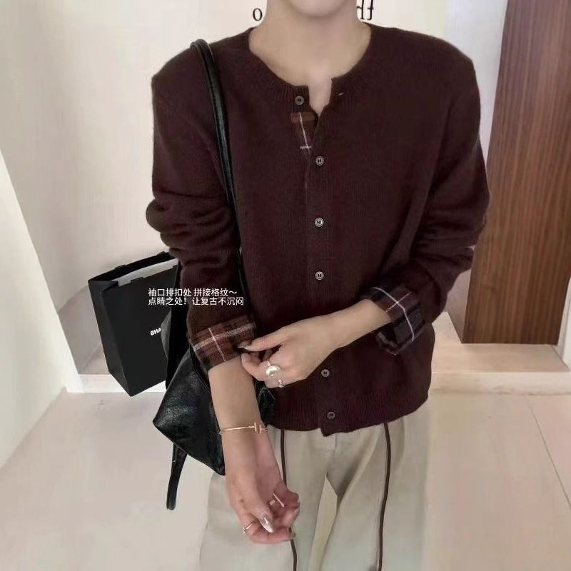 2025秋季新款全羊毛韩系撞色格子长袖针织衫女设计感毛衣开衫外套