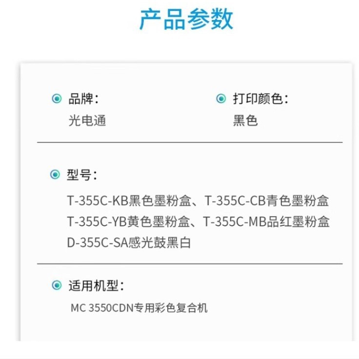 | 颜色 | 光电通T-355C-MB红粉 12000页 | 颜色 | 光电通D-355C-SA硒鼓通用 10万页 |