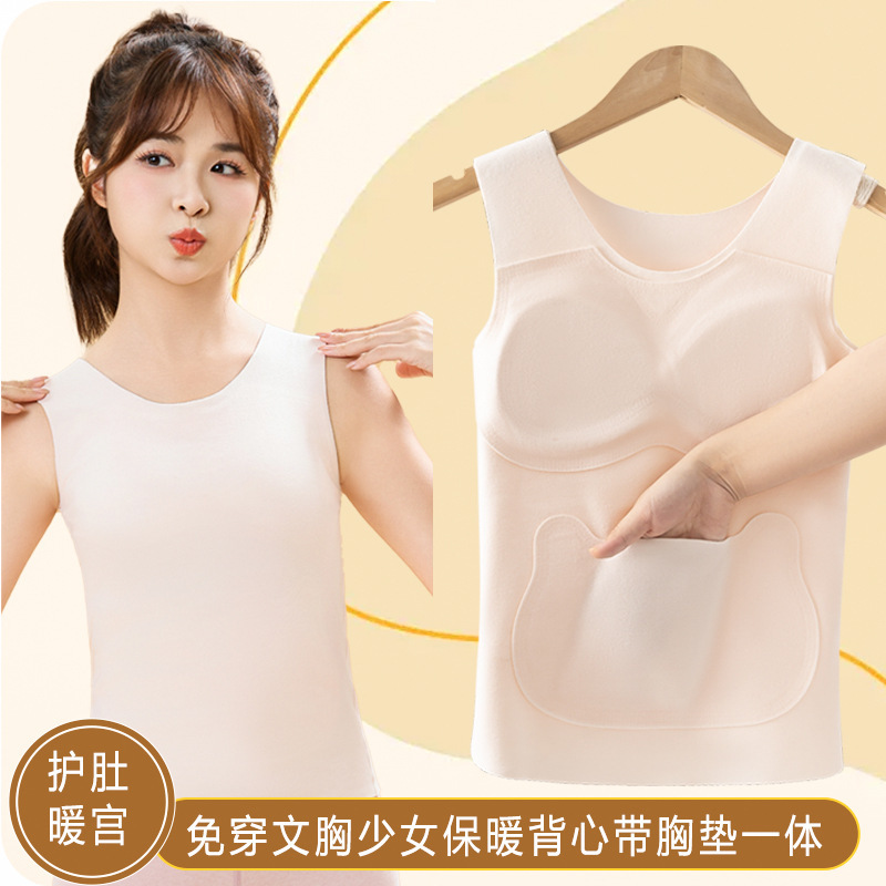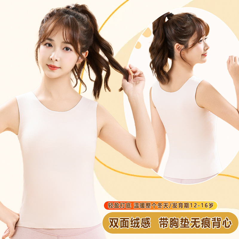 秋冬季少女发育期保暖背心德绒加热无痕上衣带胸垫打底加绒保暖衣