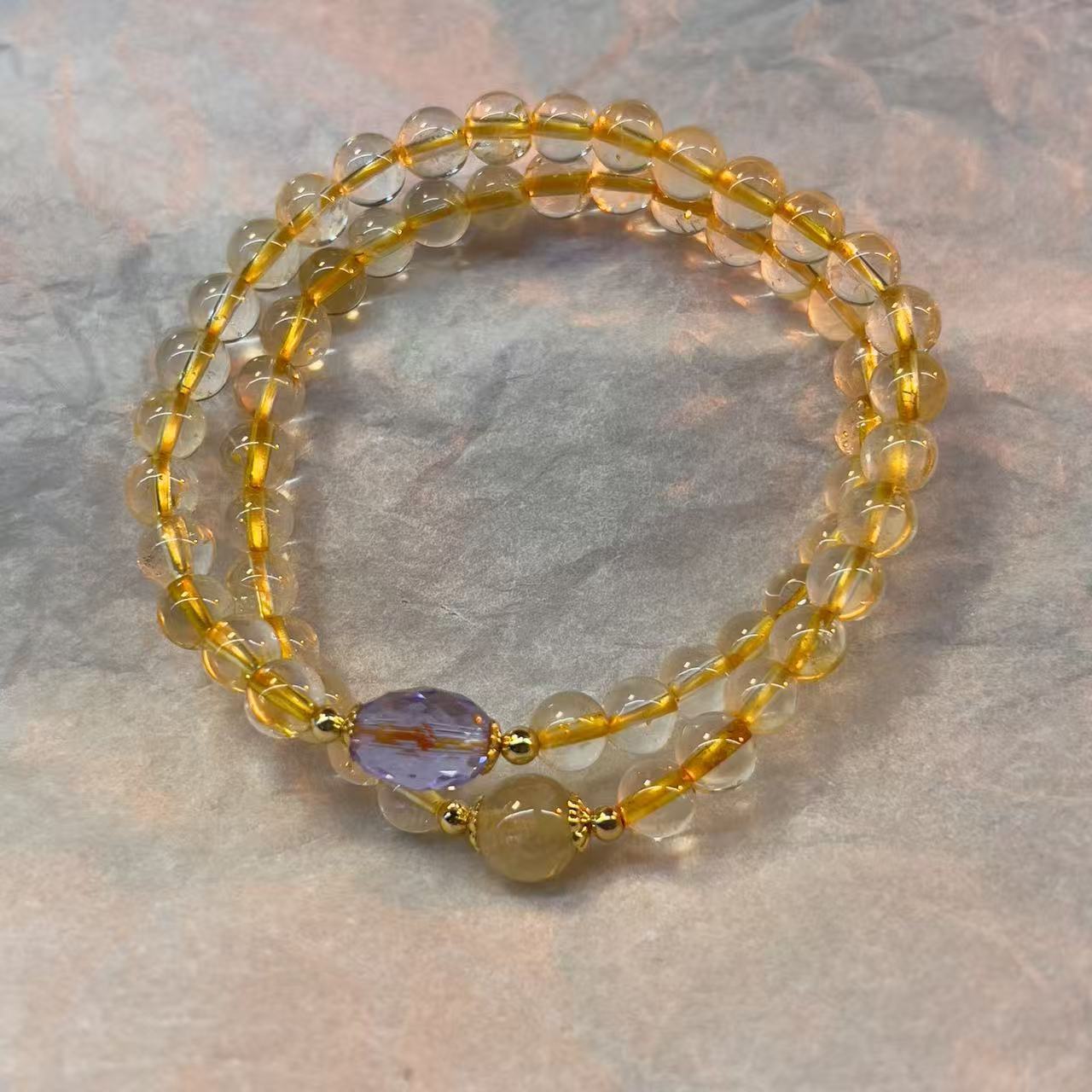 颜色 | 6mm黄水晶紫水晶双圈叠戴手链 | | 颜色 | 4+6mm虎眼金发晶紫水晶素圈叠戴招财手串 |