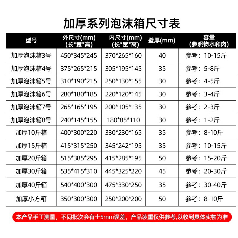 规格型号 | 加厚泡沫箱参考30斤【1个】-0x0x0cm | | 规格型号 | 加厚泡沫箱参考10斤【3个】-0x0x0cm |