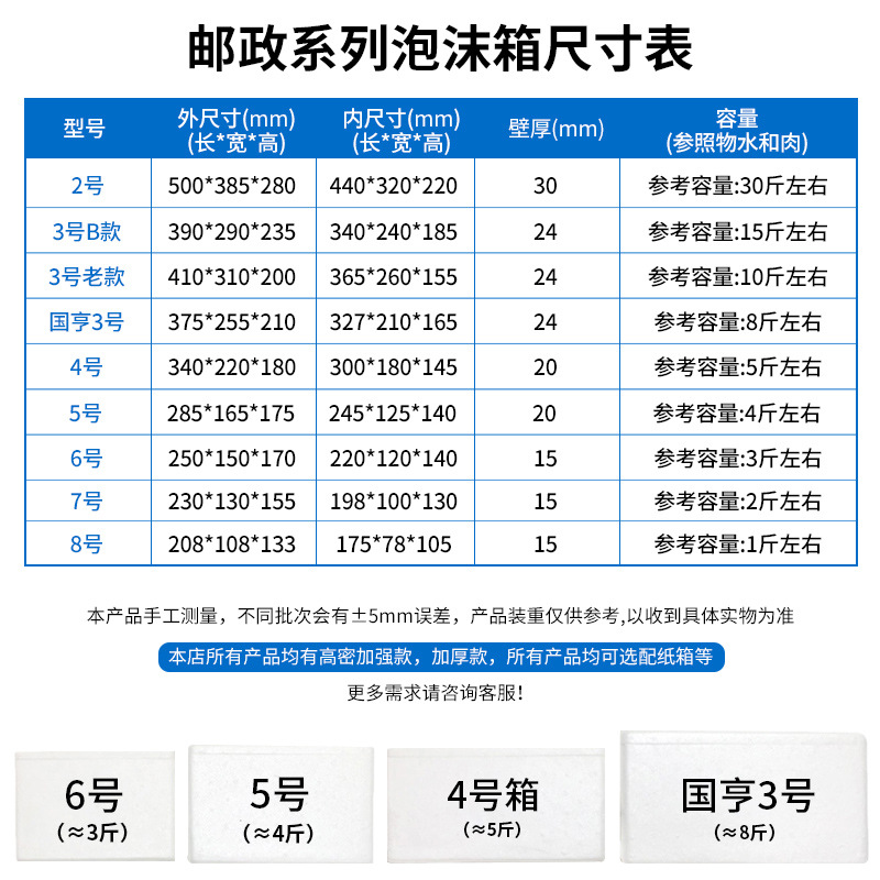 规格型号 | 高密泡沫箱5号【6个】-0x0x0cm | | 规格型号 | 加厚泡沫箱8号【10个】-0x0x0cm |