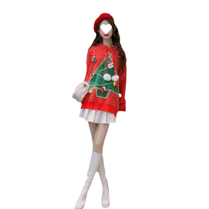 秋冬新款圣诞树毛衣小鹿毛球亮丝连帽设计感宽松甜美减龄针织衫女