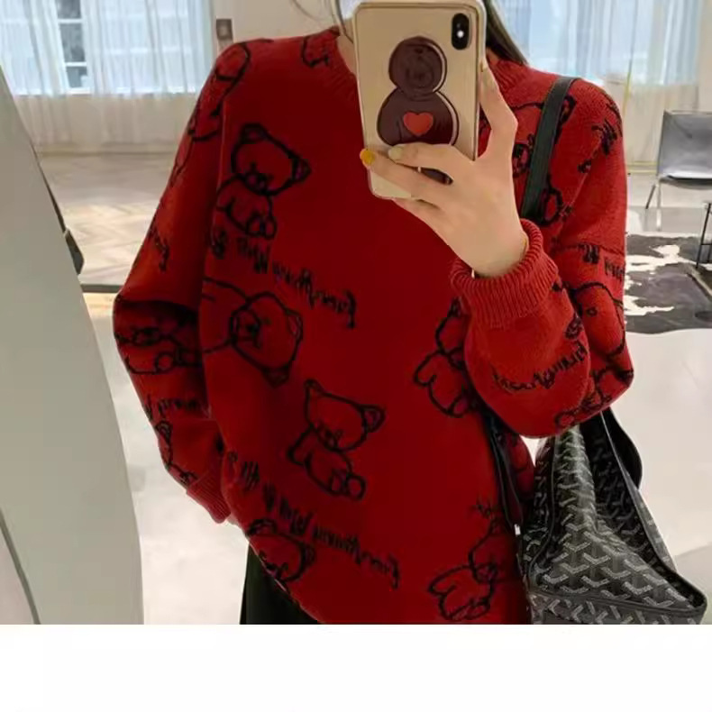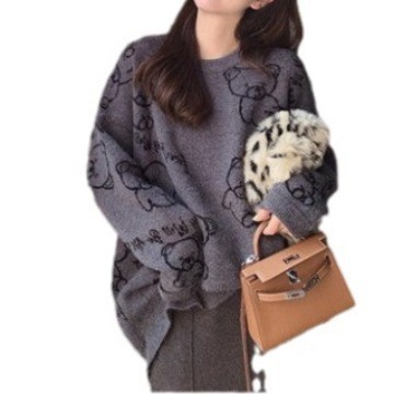小熊女士圆领毛衣宽松外穿2024年秋冬季新款休闲女装打底针织衫潮