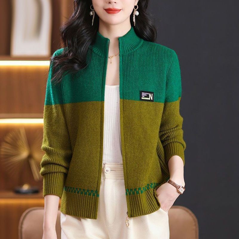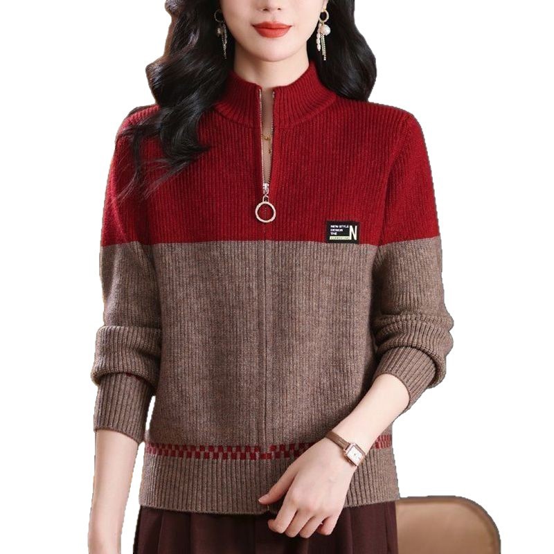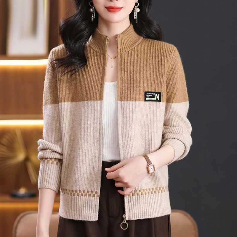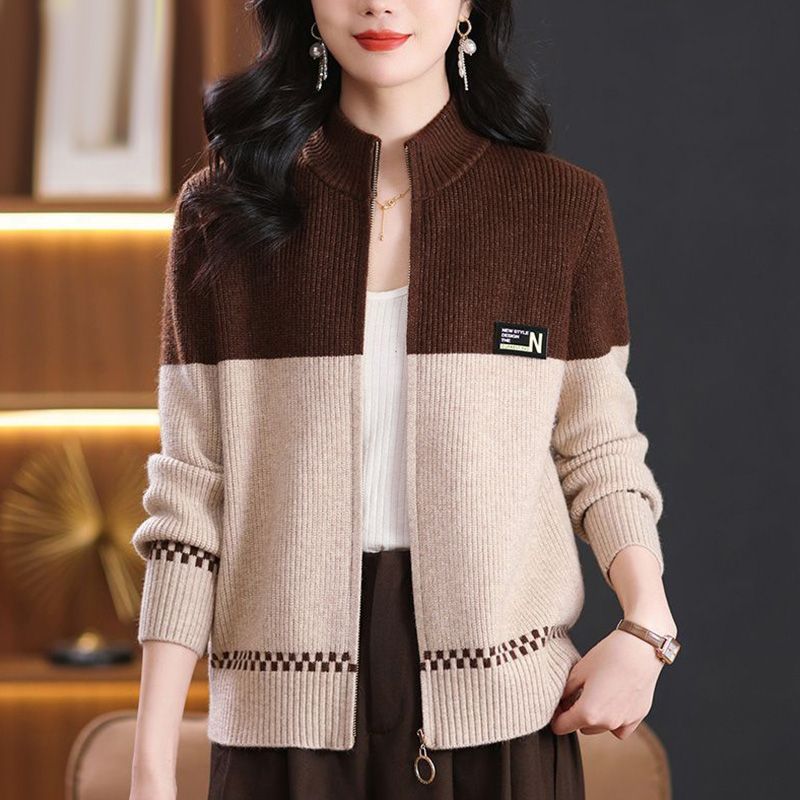 跨境新款宽松显瘦中年妈妈拉链立领开衫外套时尚拼色休闲针织衫