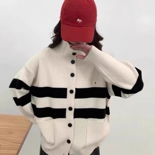 针织外套女2025秋冬新款复古学院系宽松长袖毛衣女慵懒风立领条纹