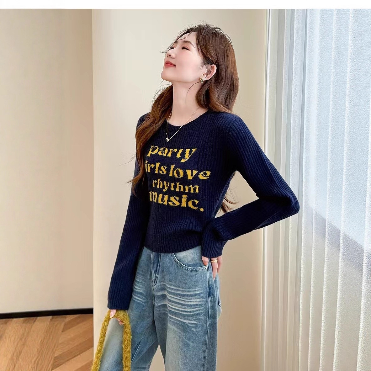 新款韩系木耳边字母长袖针织衫短款打底内搭毛衣外贸针织衫百搭