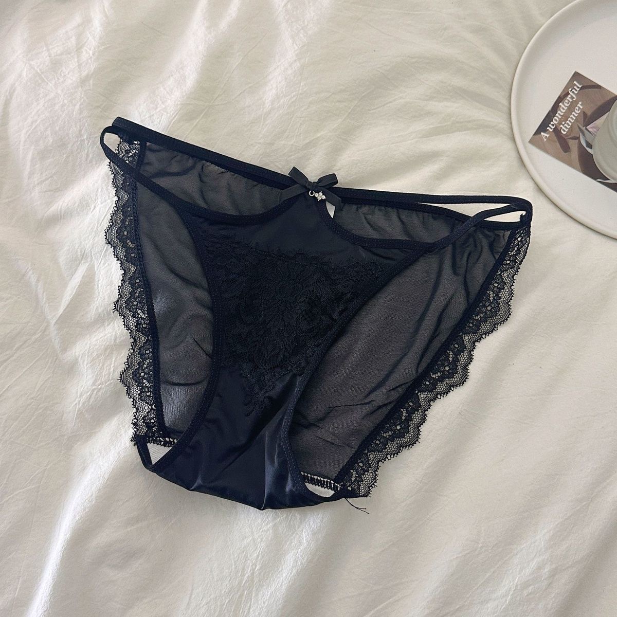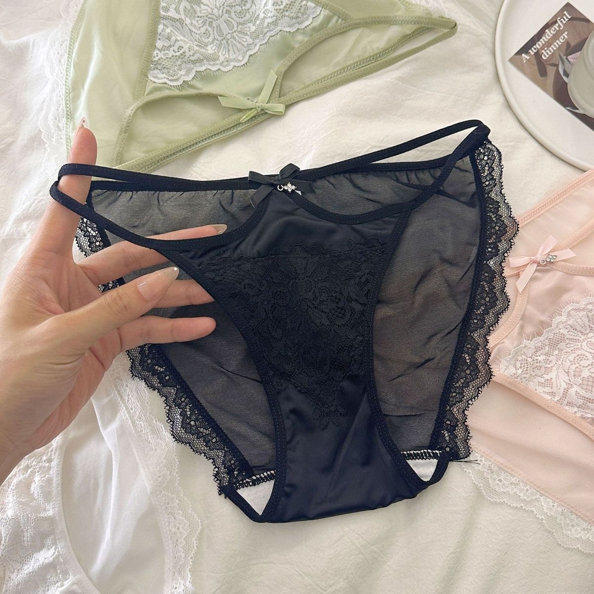 法式性感蕾丝内裤女细带缎面镂空纯欲舒适透气网纱少女生三角内裤