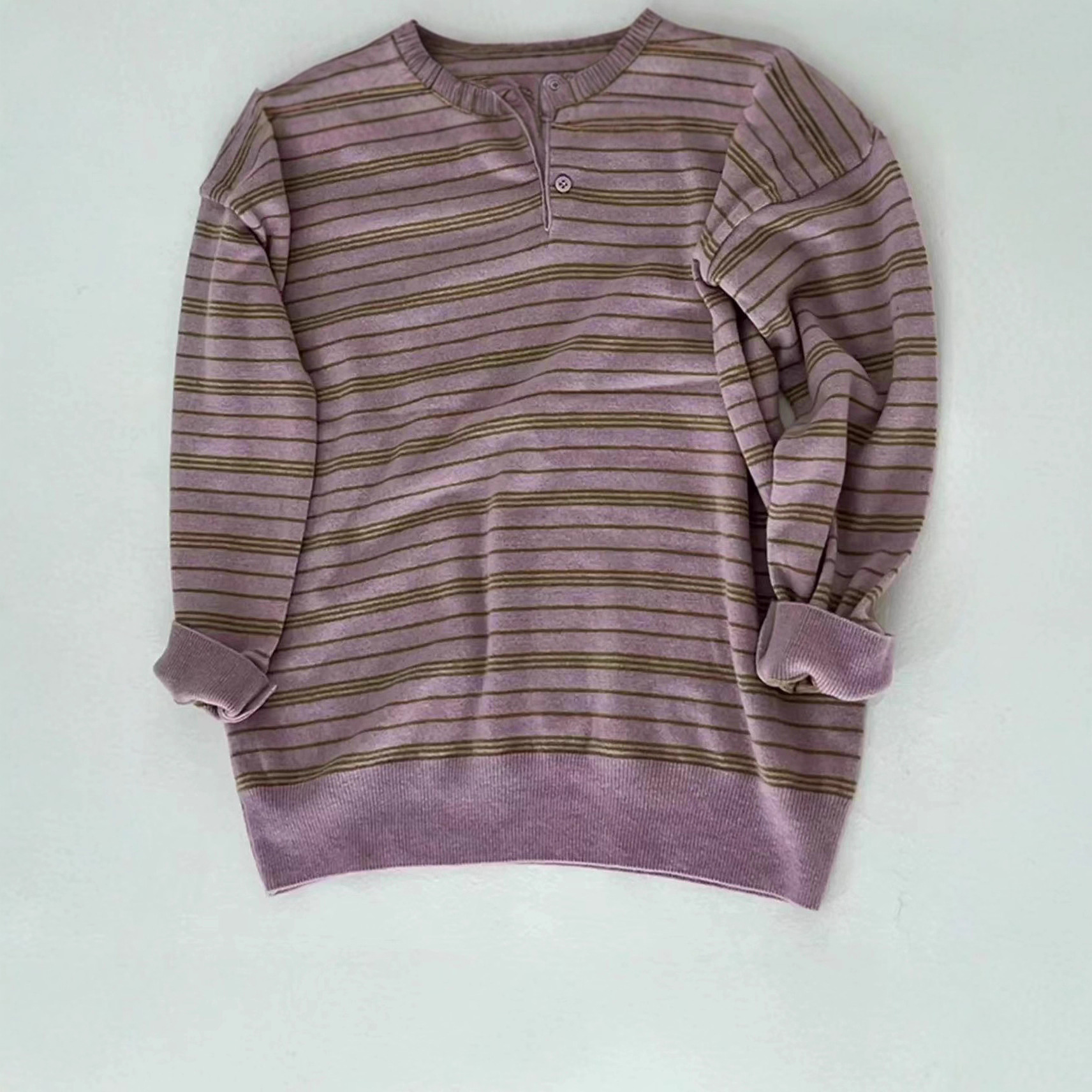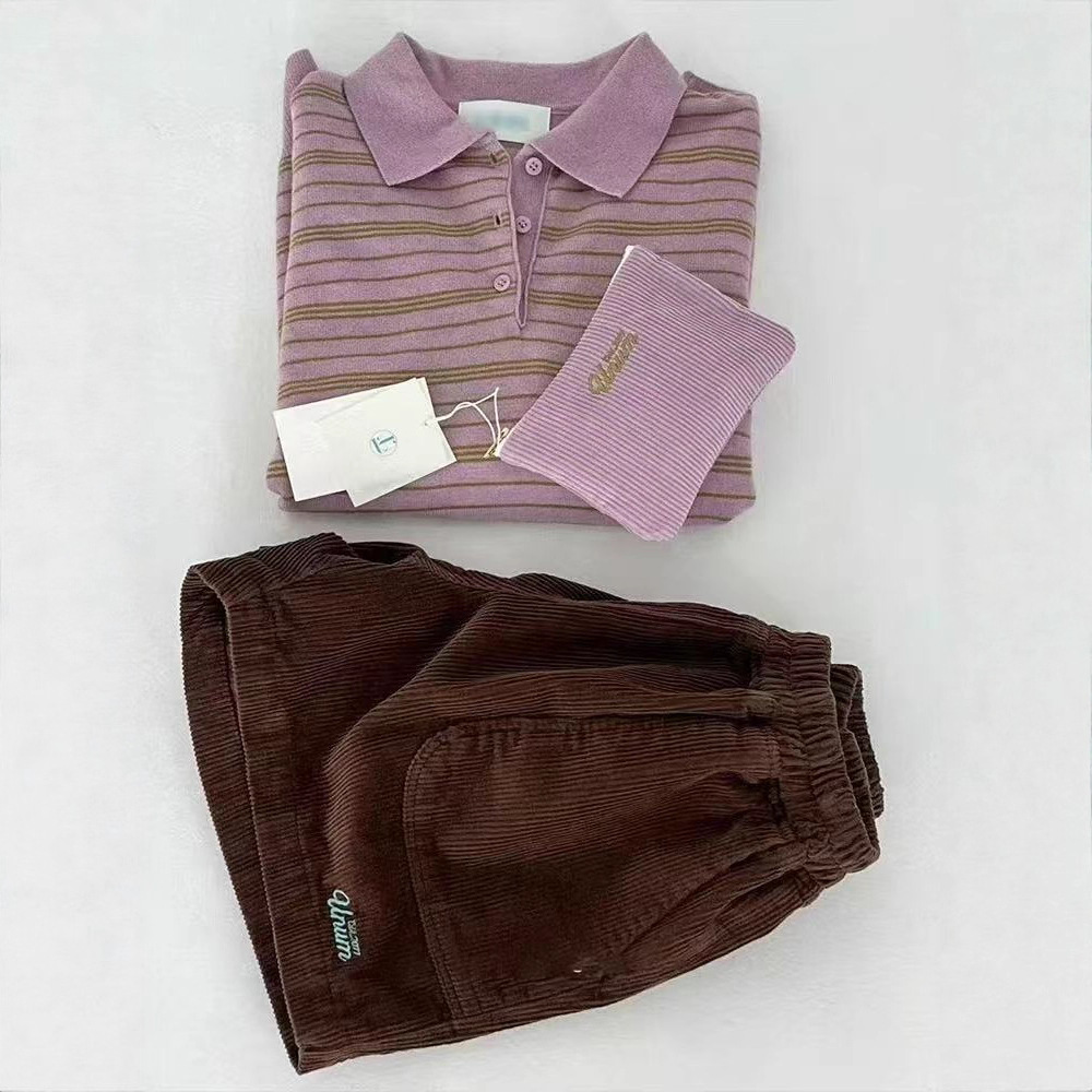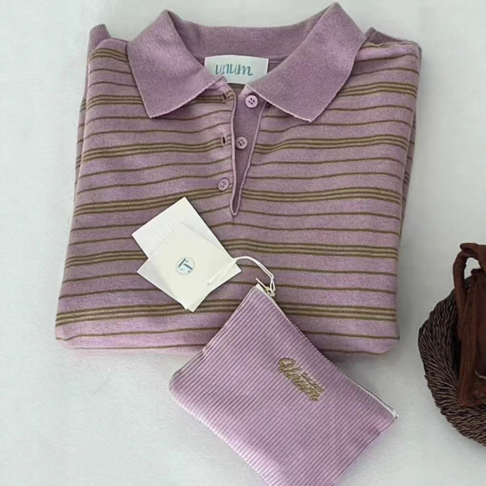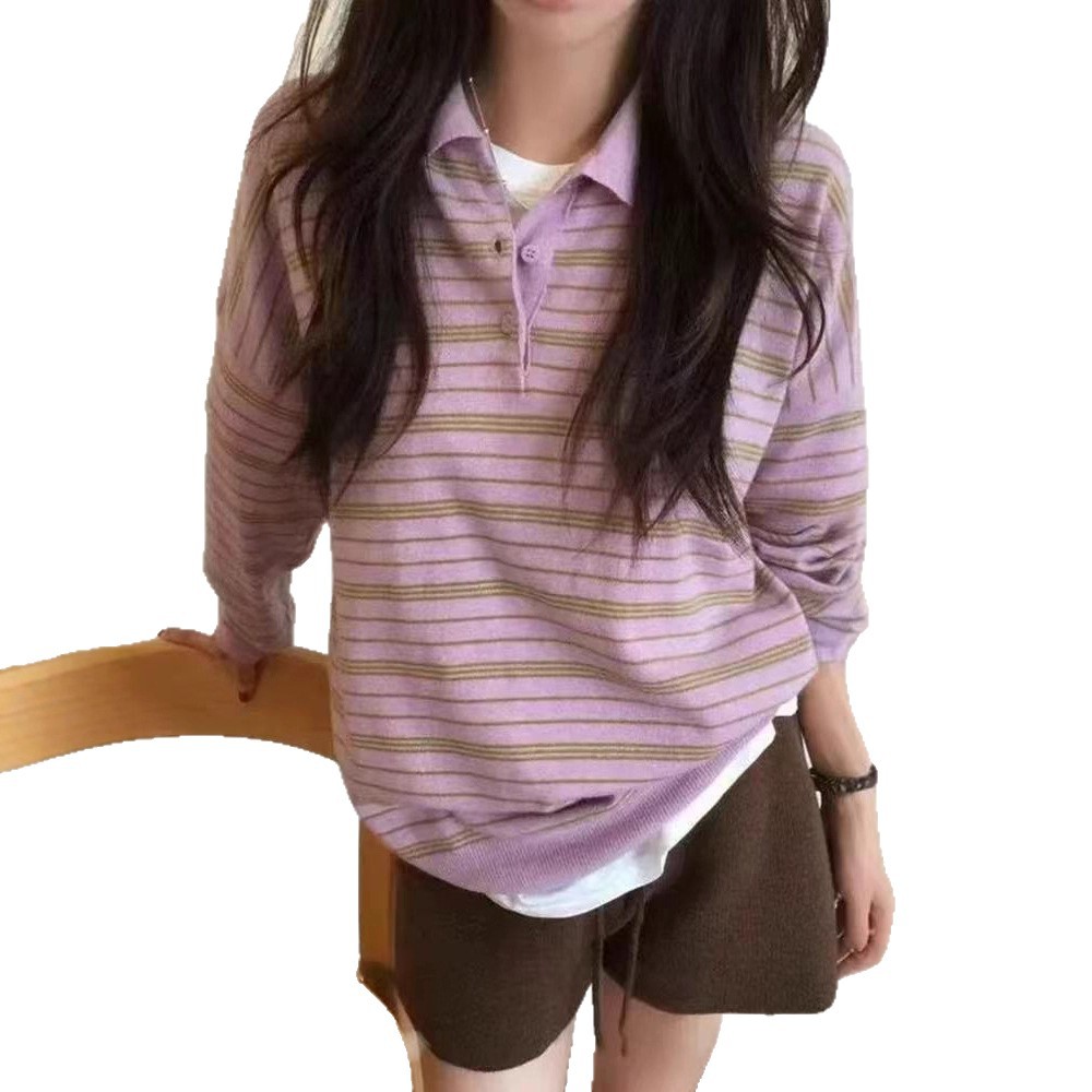 韩系温柔粉色条纹polo领针织衫女秋季学院风慵懒长袖条纹毛衣上衣