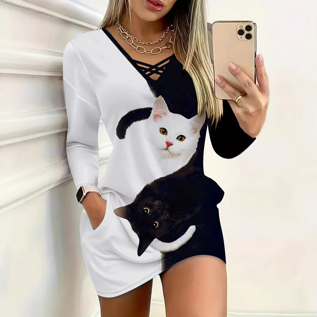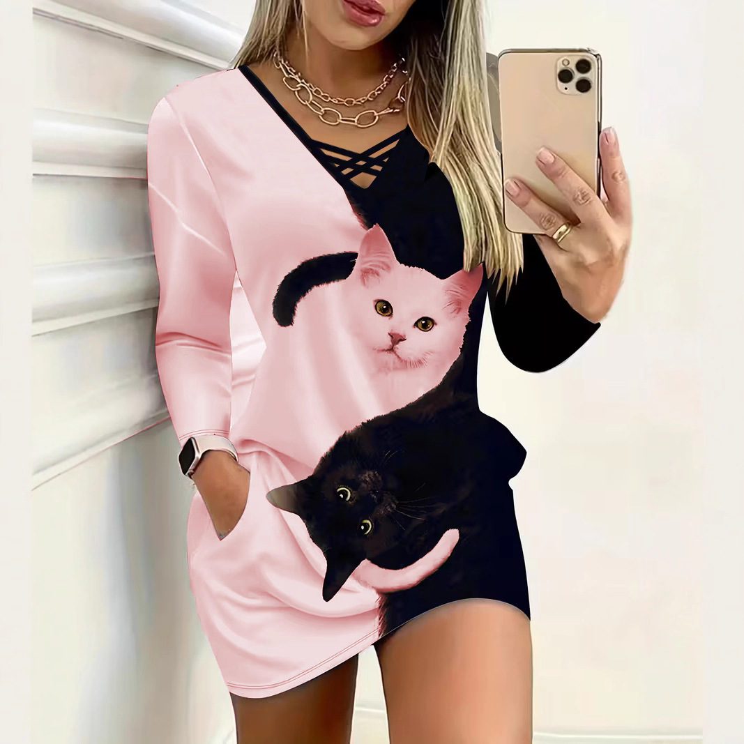 欧美2025亚马逊TEMU秋冬拼色交叉口袋V领条纹优雅休闲长袖连衣裙