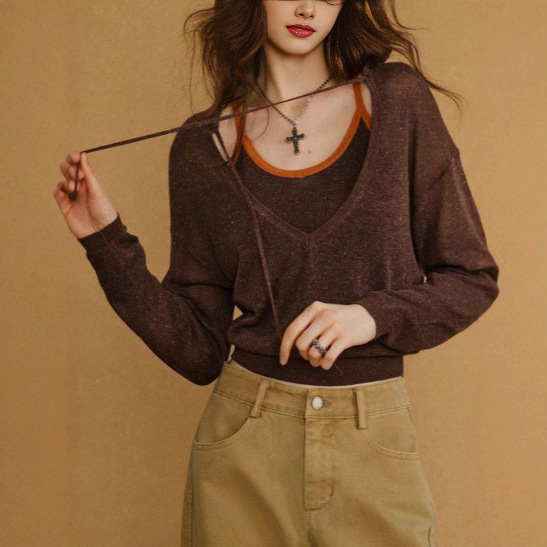 早秋巨好看的咖啡色短款针织衫秋款挂脖修身背心+长袖上衣两件套