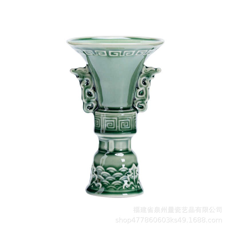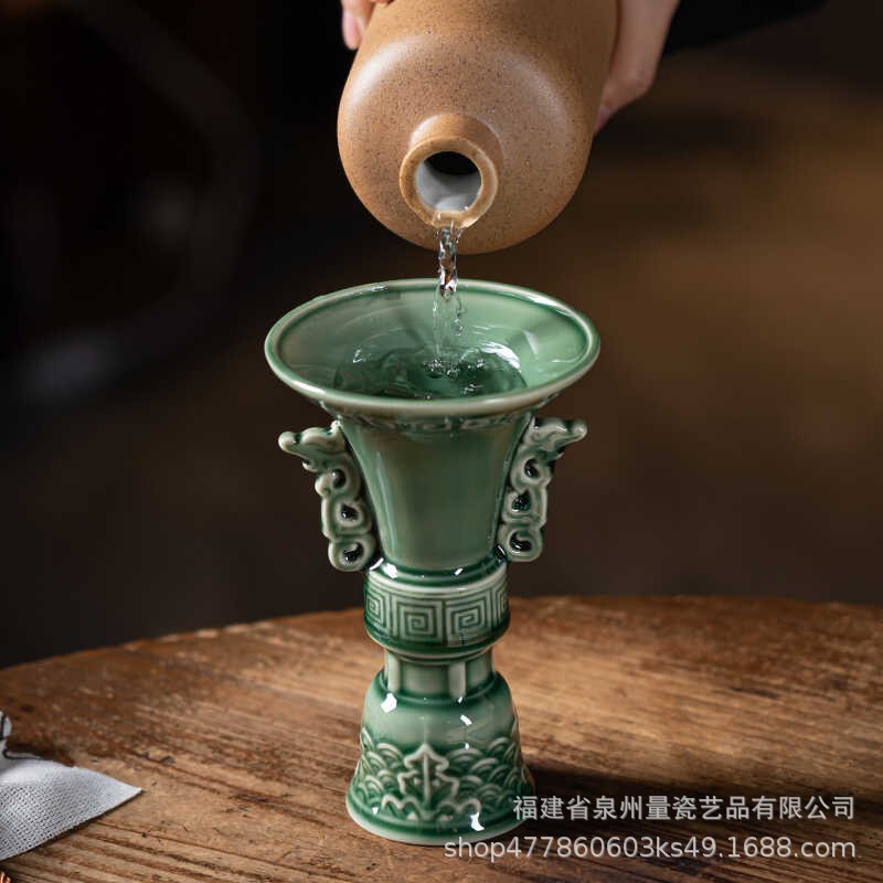 仿古酒杯青瓷觚杯白酒烈酒高脚杯大容量二两创意酒樽陶瓷果盆批发