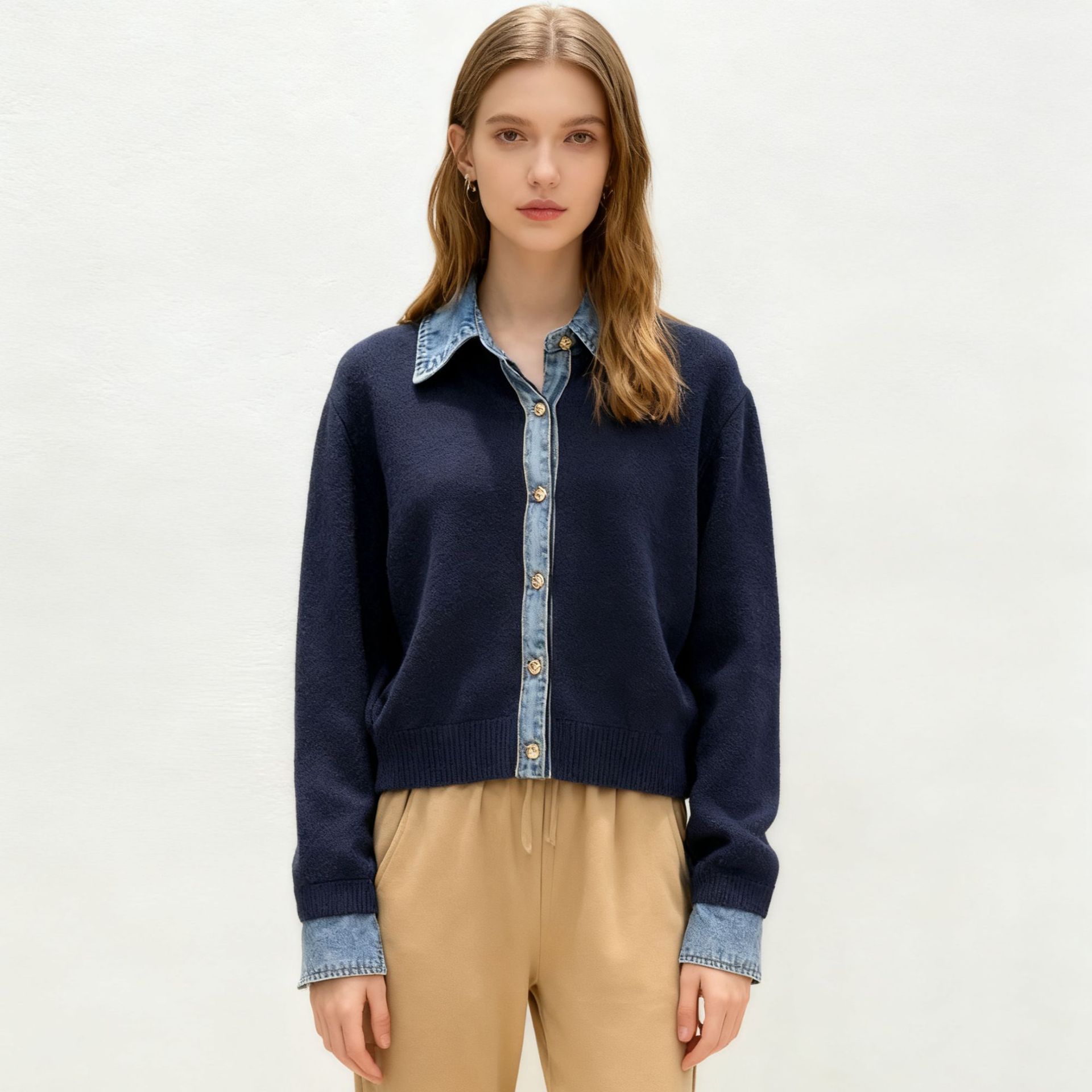 日韩热销牛仔拼接针织开衫秋季新款时尚显瘦针织衫毛衣女开衫外套