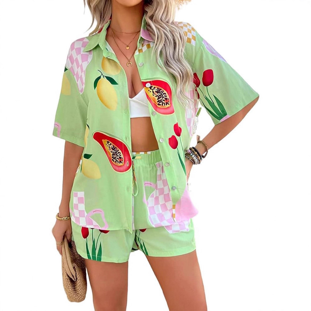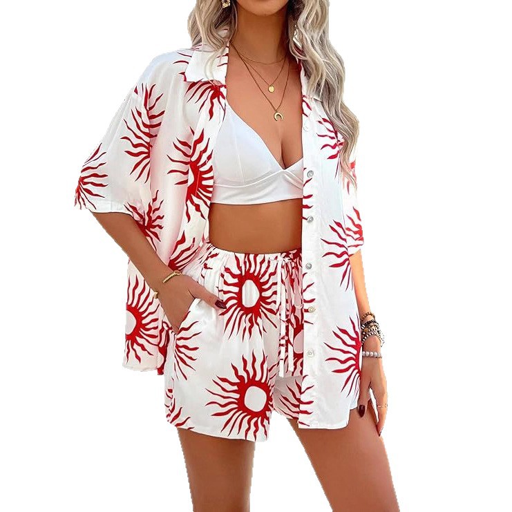 独立站跨境女士3D印花衬衫两件套短裤和短袖衬衫休闲短裤套装夏季