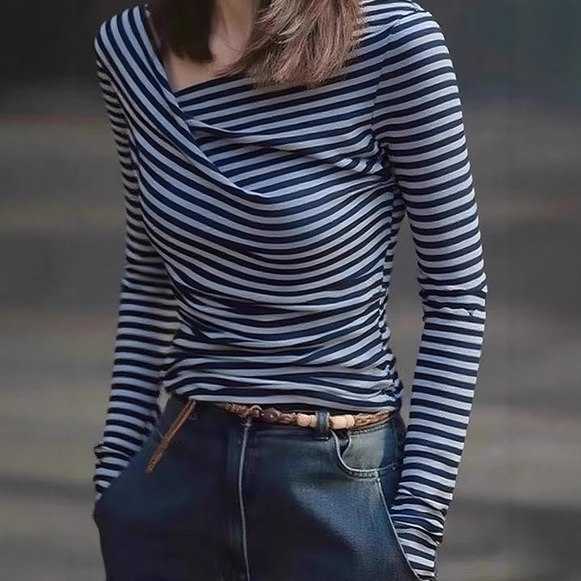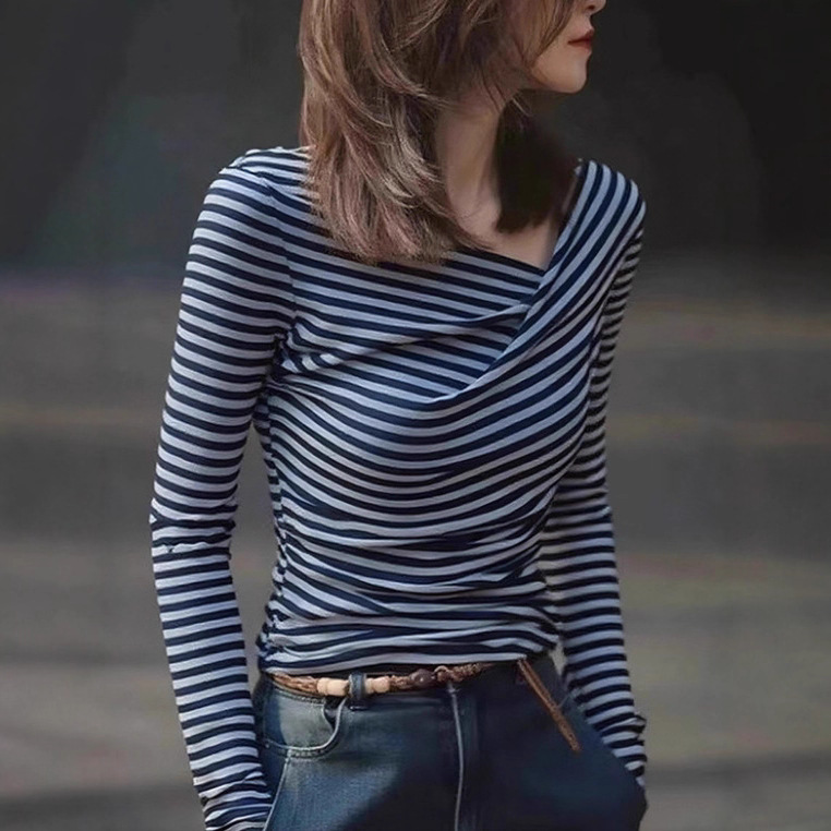 秋季绝美巨好看上衣轻熟小众设计气质高级感不规则褶皱条纹针织衫