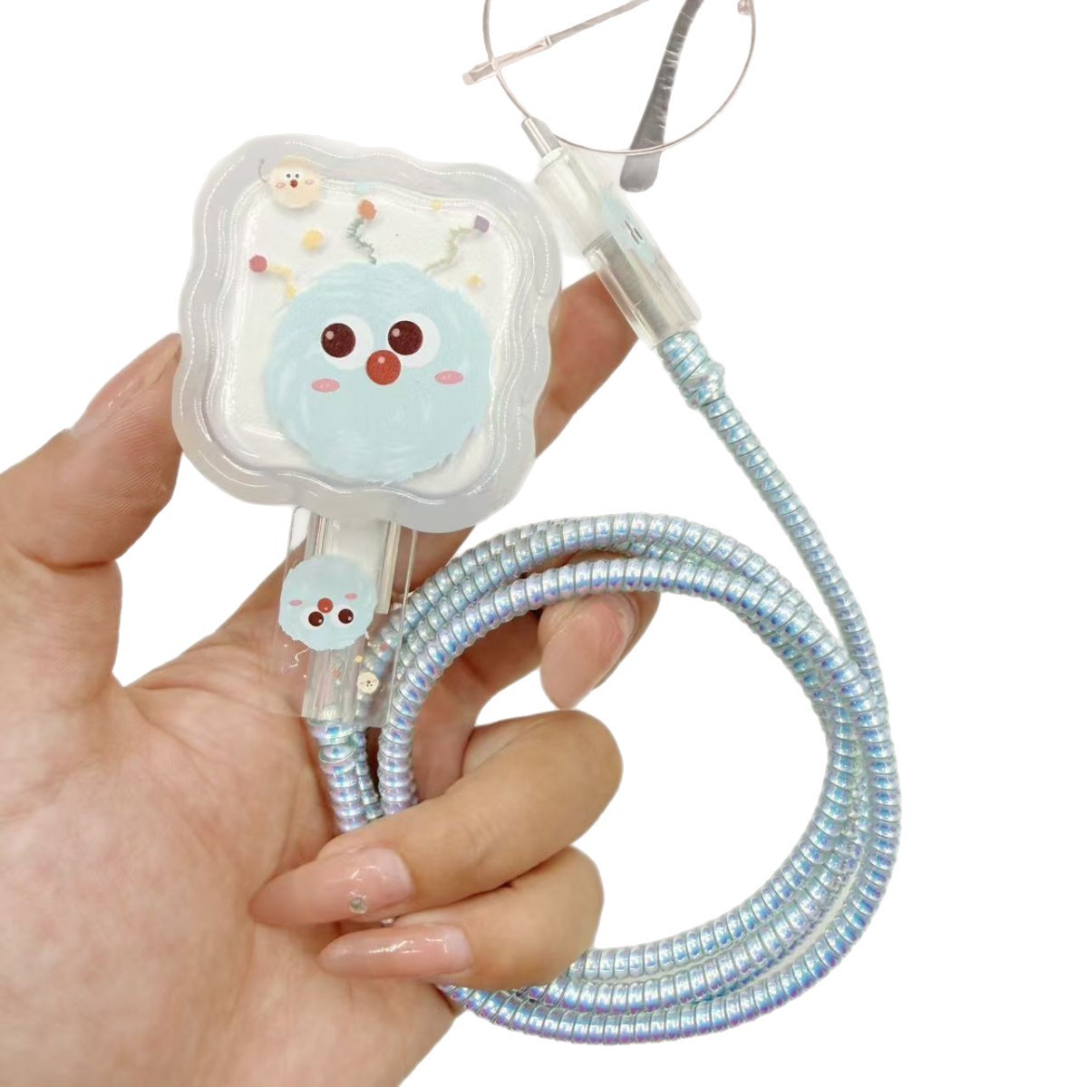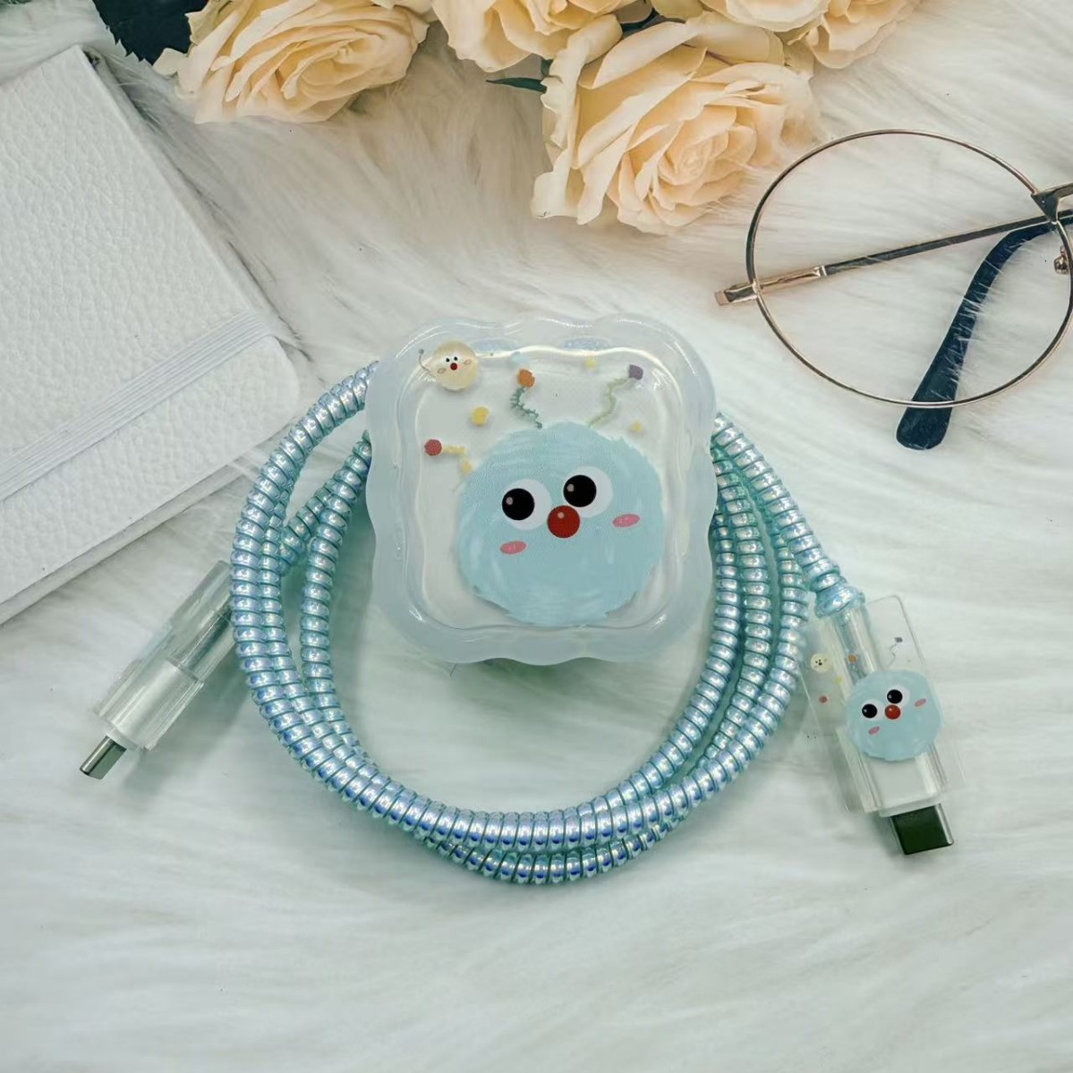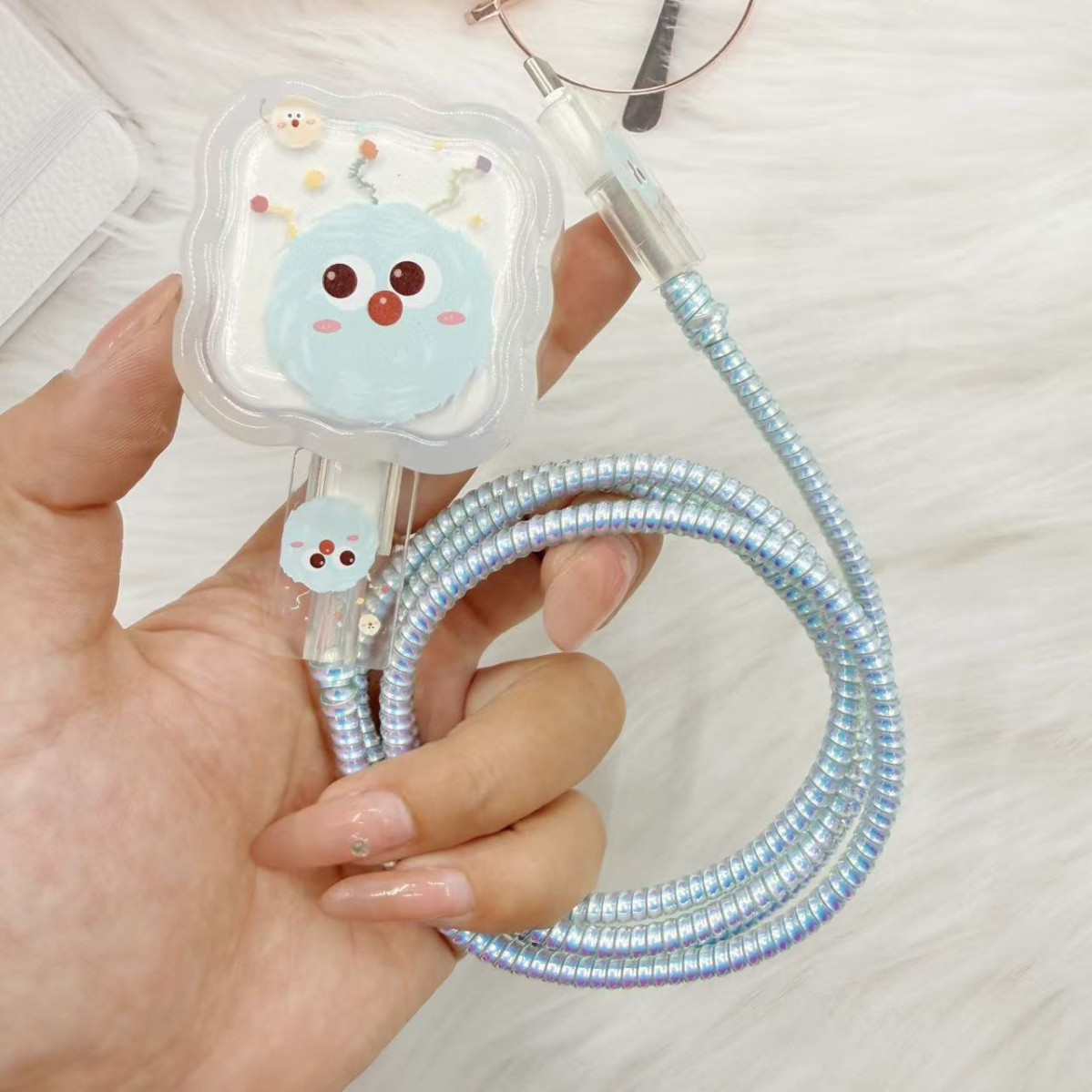 苹果蓝色毛球数据线保护套适用于苹果40W快充充电器保护套防折断