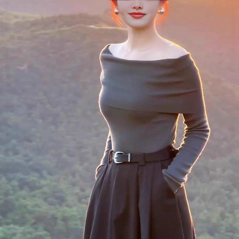 一字领灰色长袖针织衫女2025秋季流行穿搭巨好看轻熟气质修身打底