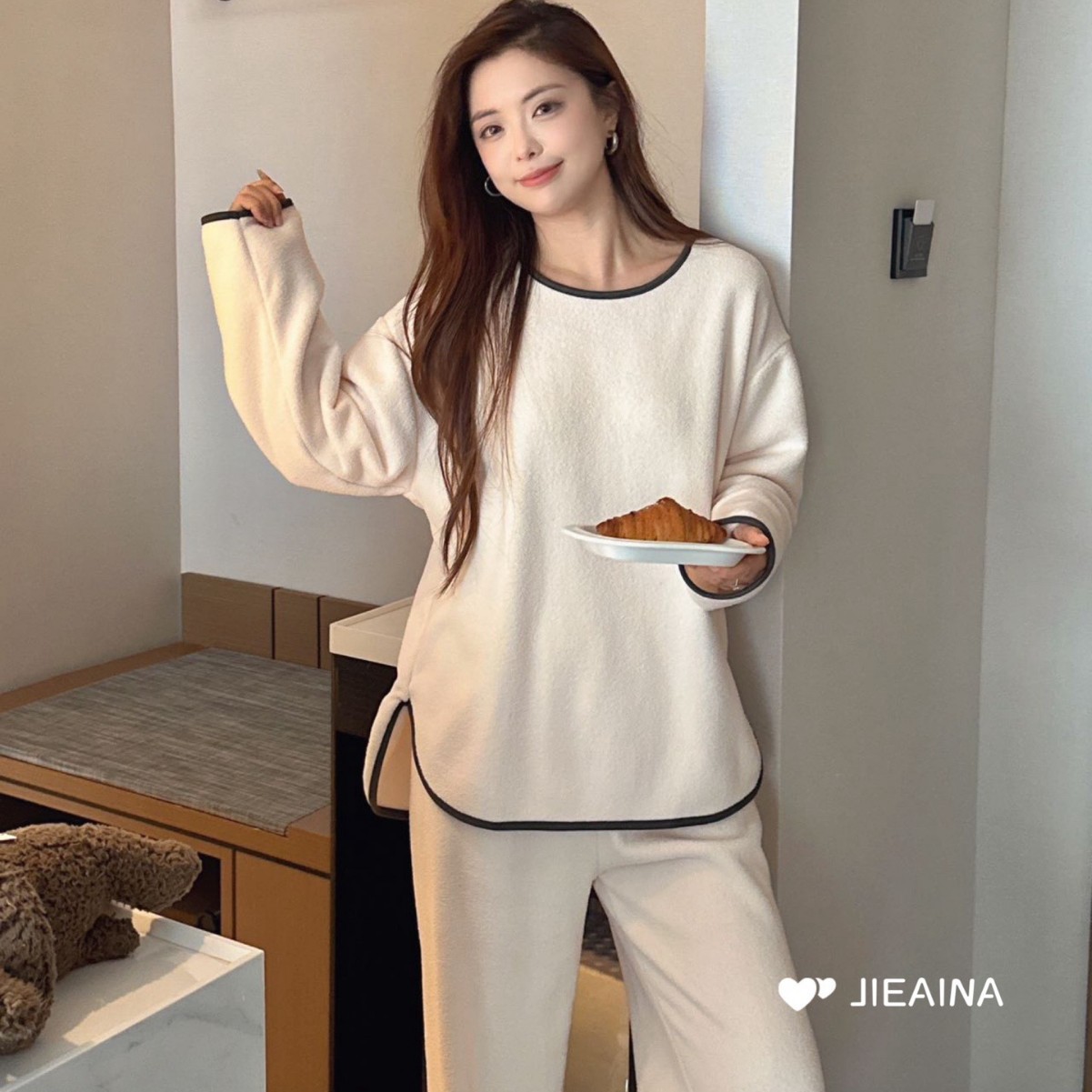 JIEAINA简约休闲风撞色美学睡衣套装女秋冬新款云舒绒圆领家居服