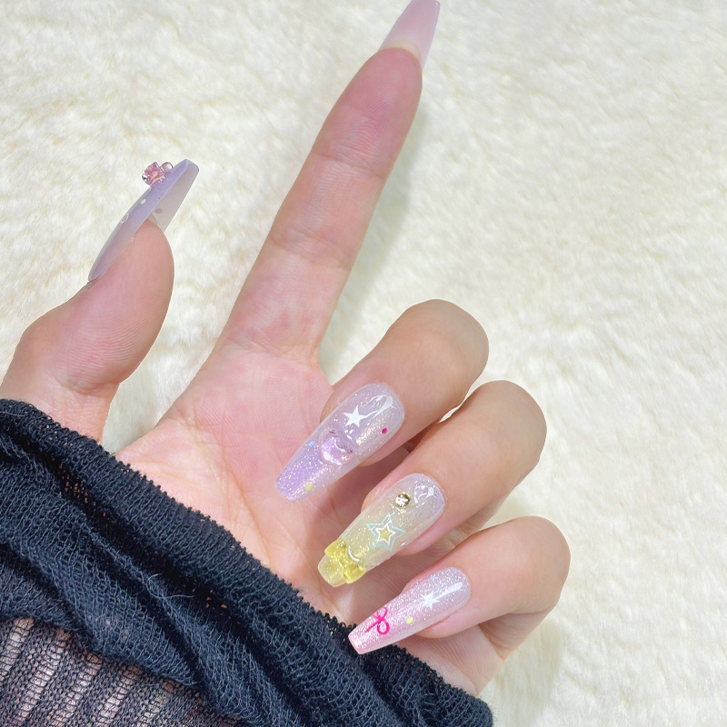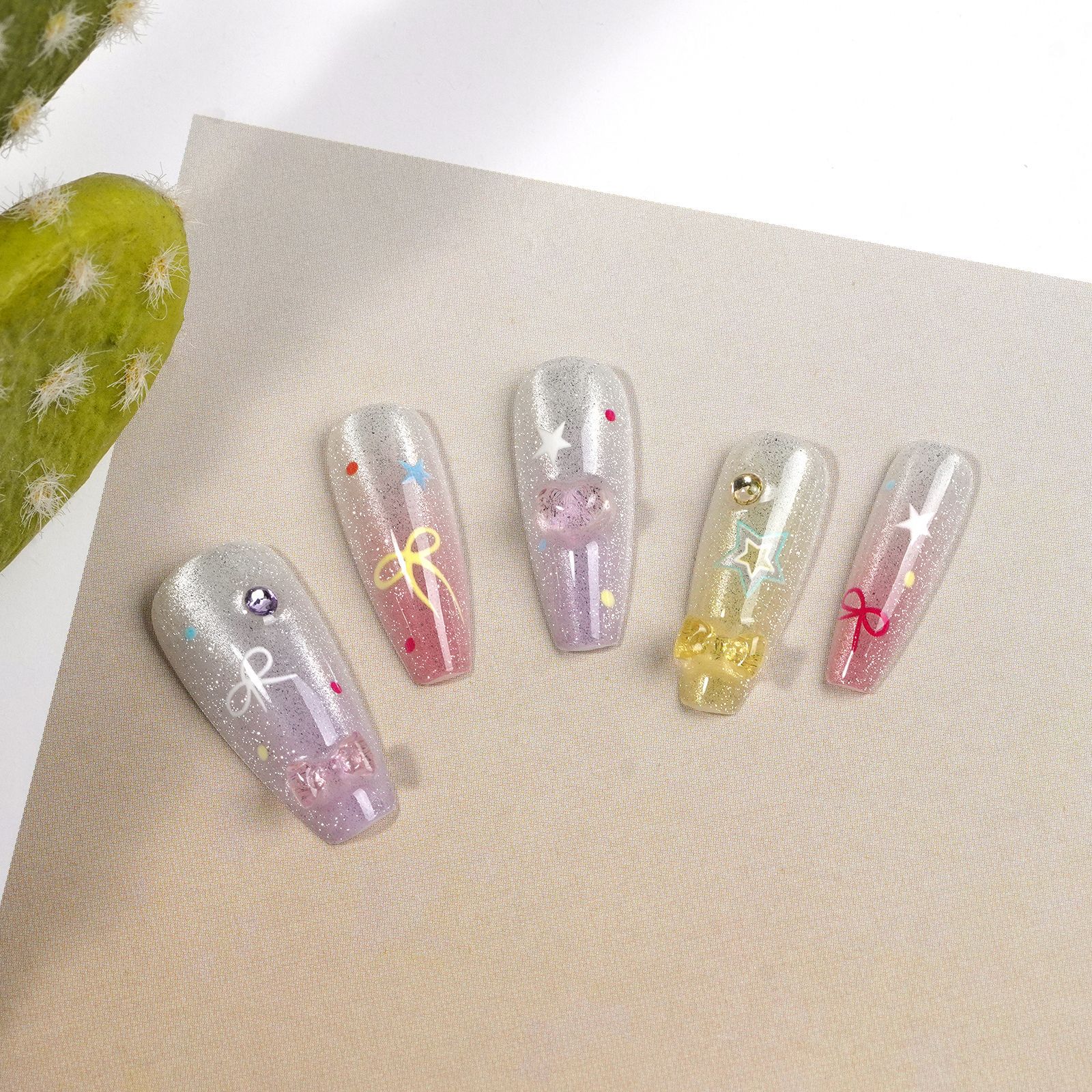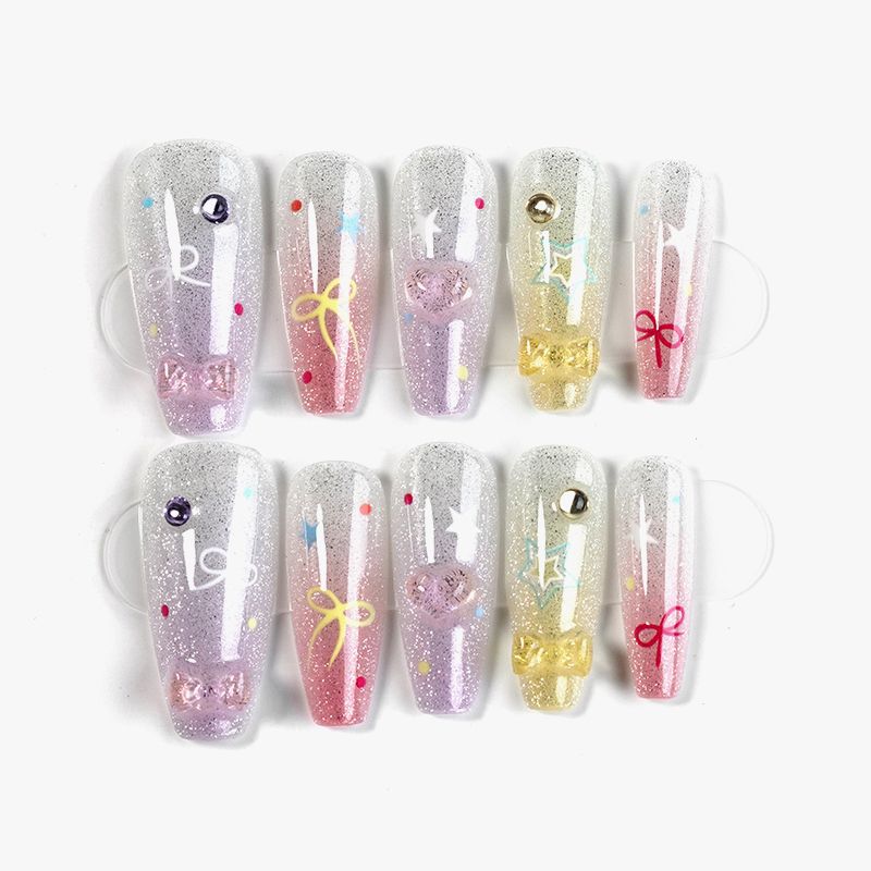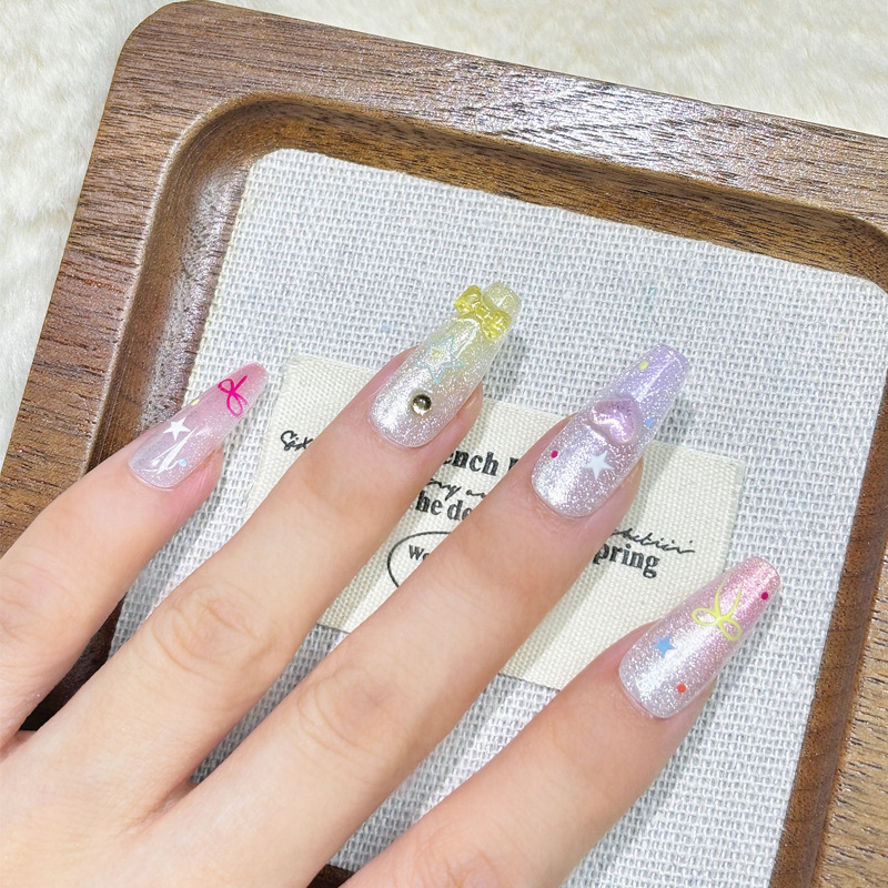 新款多巴胺卡通蝴蝶结美甲 小清新长梯冰透手工穿戴甲甲片10片装