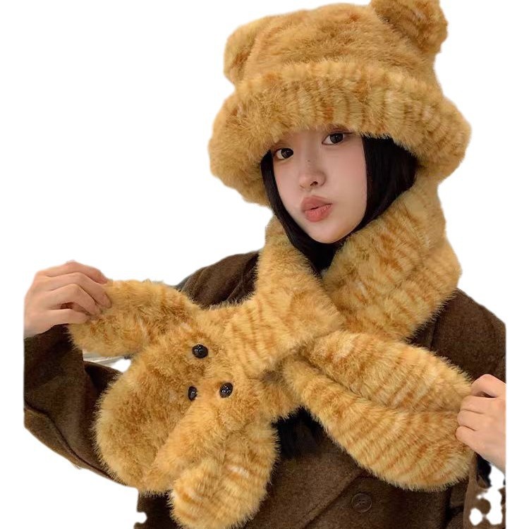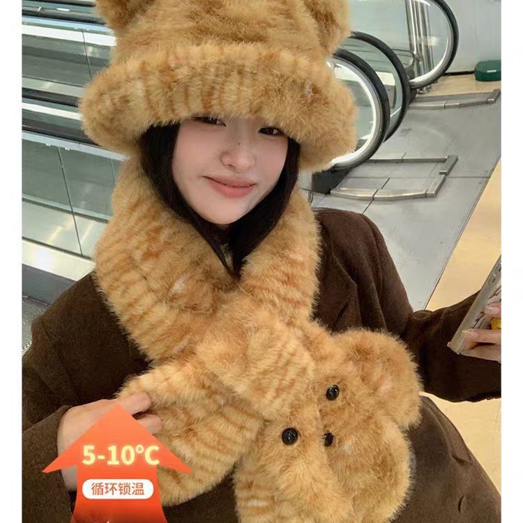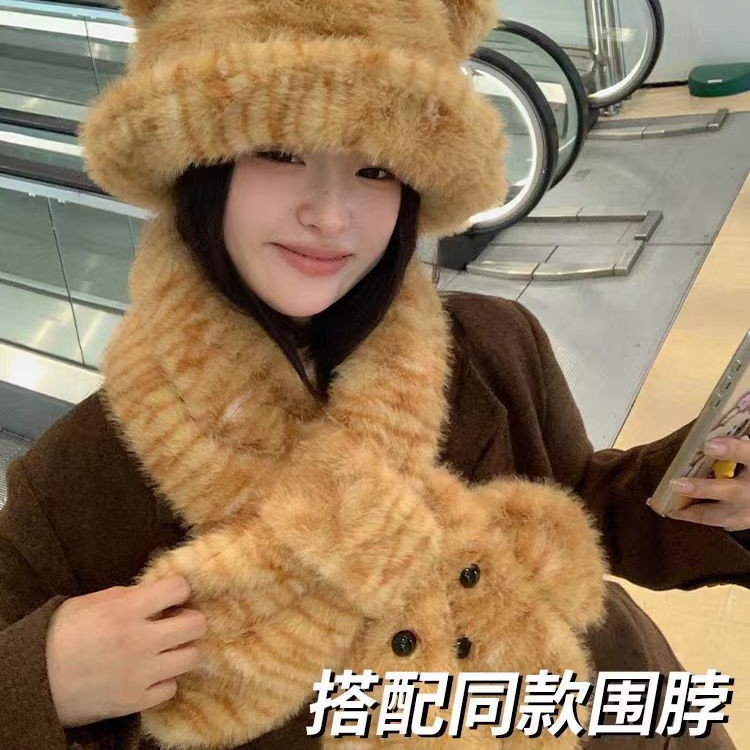 帽子虎纹可爱小熊耳朵毛绒绒渔夫帽子女秋冬保暖卡通围巾围脖护颈
