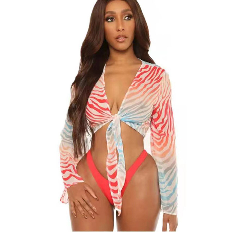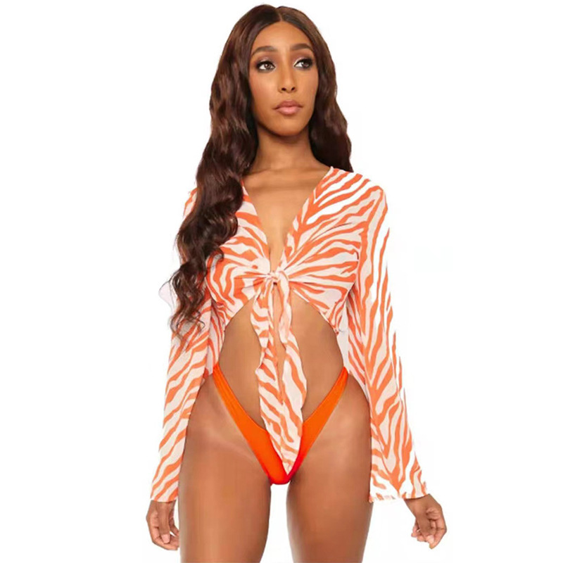 欧美跨境分体泳衣女比基尼三件套新款深V聚拢露背长袖罩衫比基尼