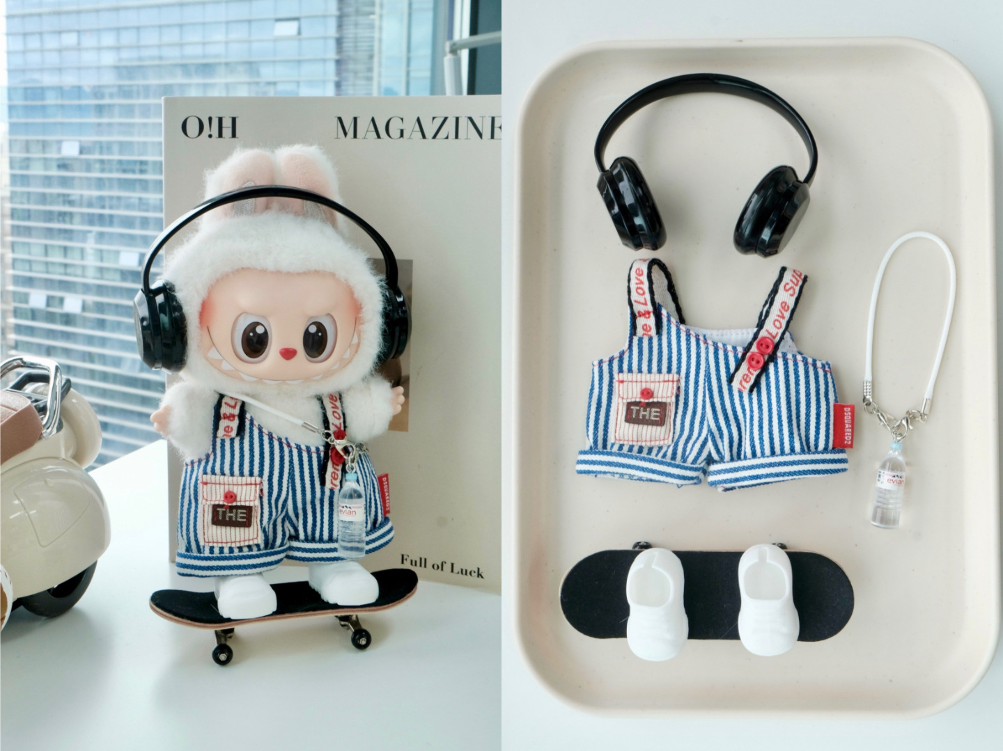 | 颜色 | (不含娃)草帽星球五件套:草帽+上衣+裤子+鞋+保温杯 | 颜色 | (不含娃)滑板少年四件套:耳机+背带裤+滑板鞋+挂件 |