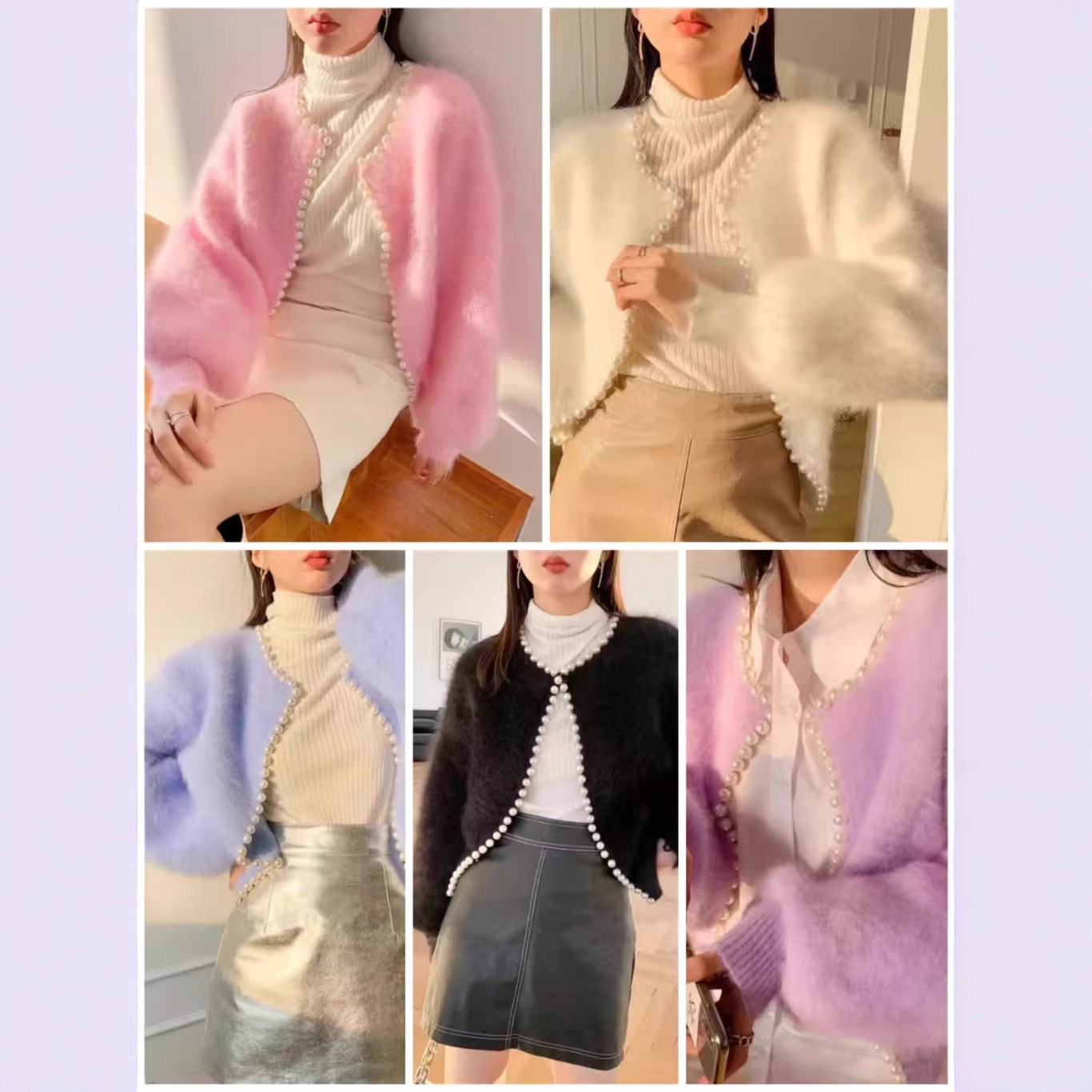 秋冬季仿貂毛针织上衣女宽松慵懒风灯笼袖钉珠珍珠边毛衣外套开衫