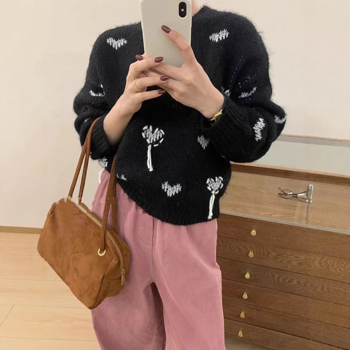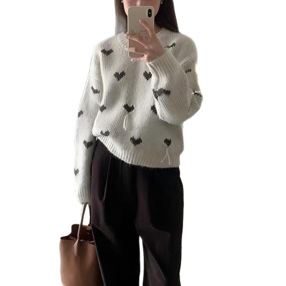 小众甜美风设计感爱心印花圆领毛衣女秋冬复古减龄软糯针织衫上衣