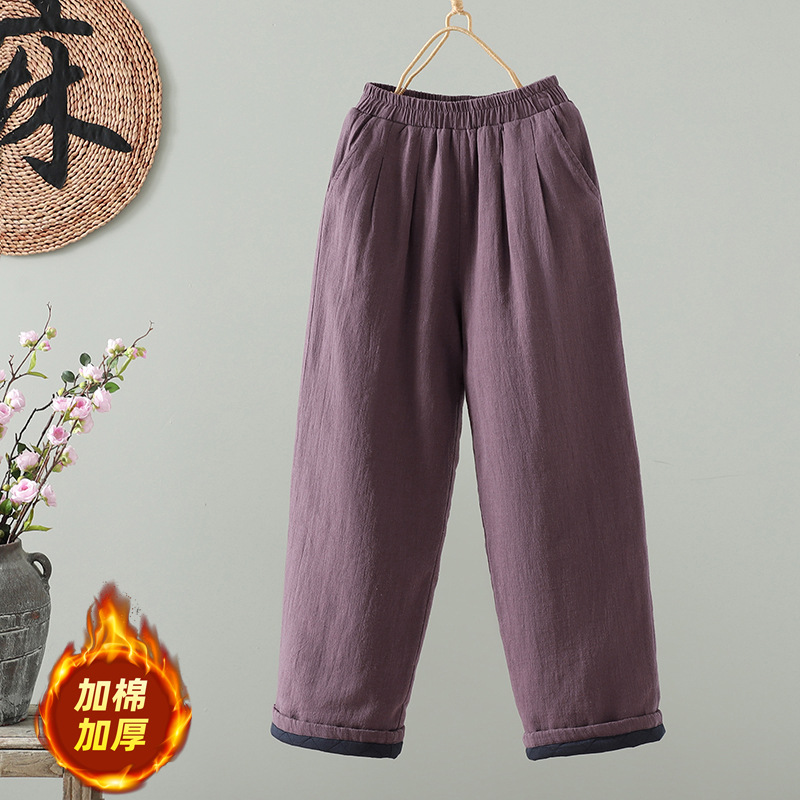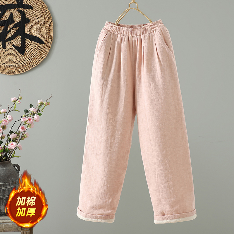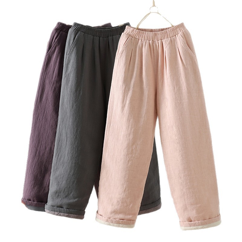 冬棉麻直筒休闲裤子夹棉加厚女保暖显瘦外穿棉裤苎麻阔腿裤