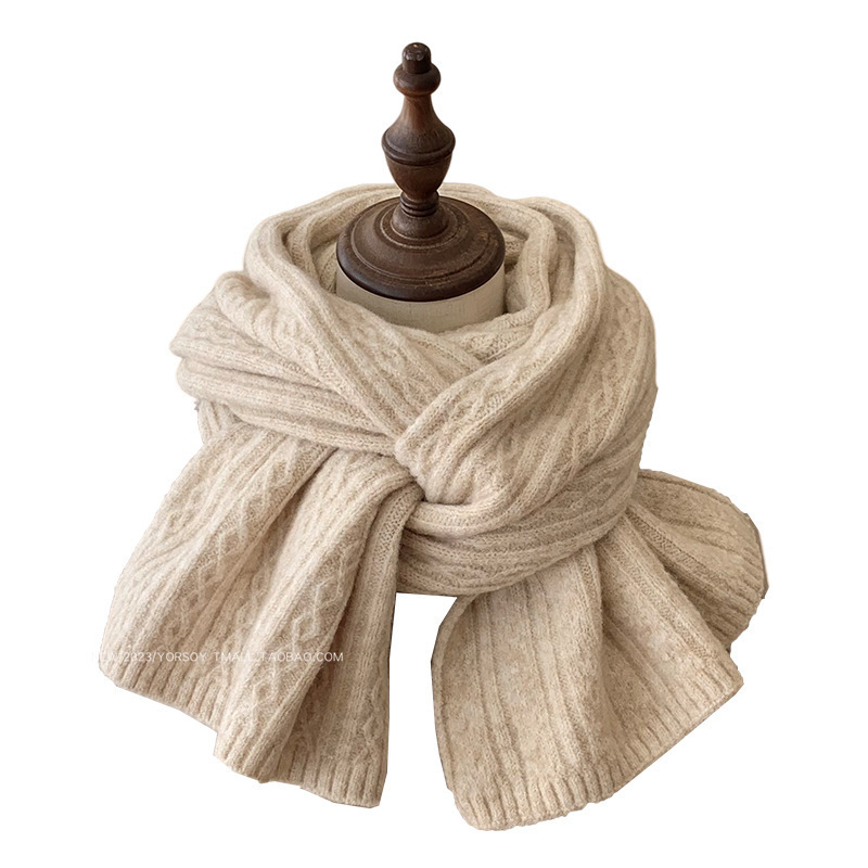 软糯米白色纯色围巾女冬季复古麻花保暖加厚针织毛线学院风围脖男