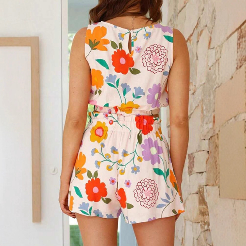 欧美外贸亚马逊新款热售无袖两件套花卉印花休闲松紧腰短裤套装
