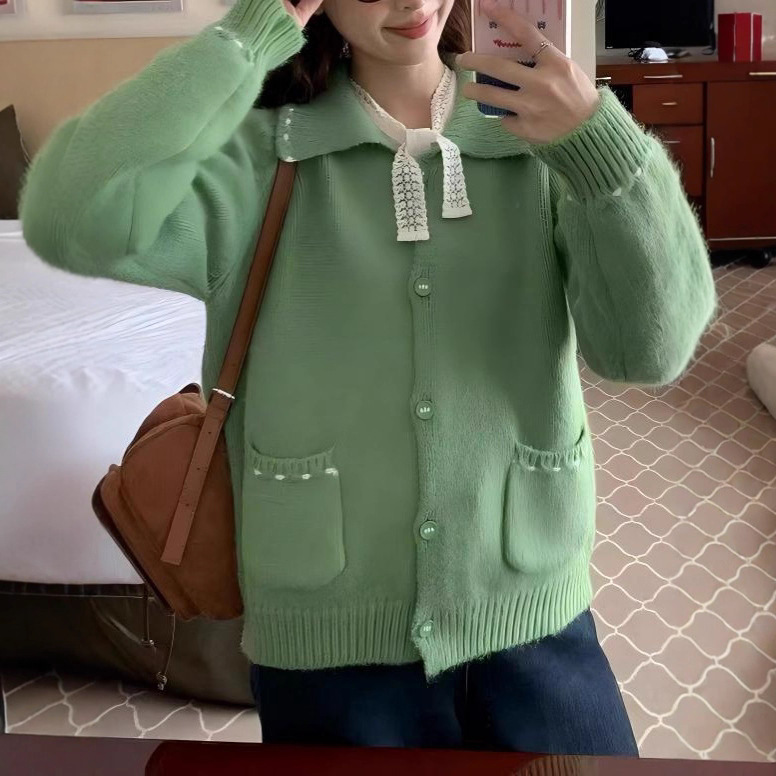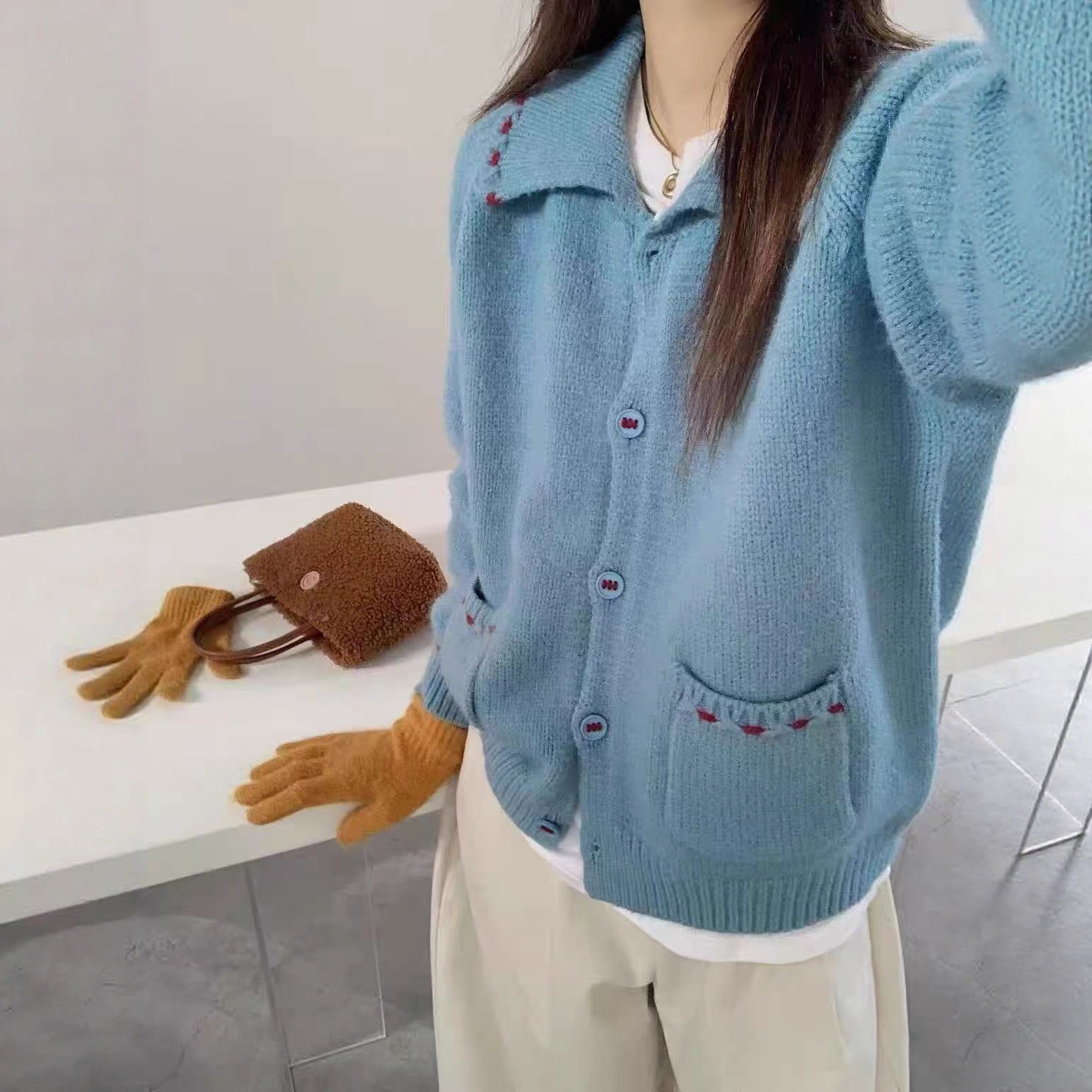 韩系慵懒风翻领撞色毛衣外套女2025年新款秋冬针织衫宽松开衫上衣