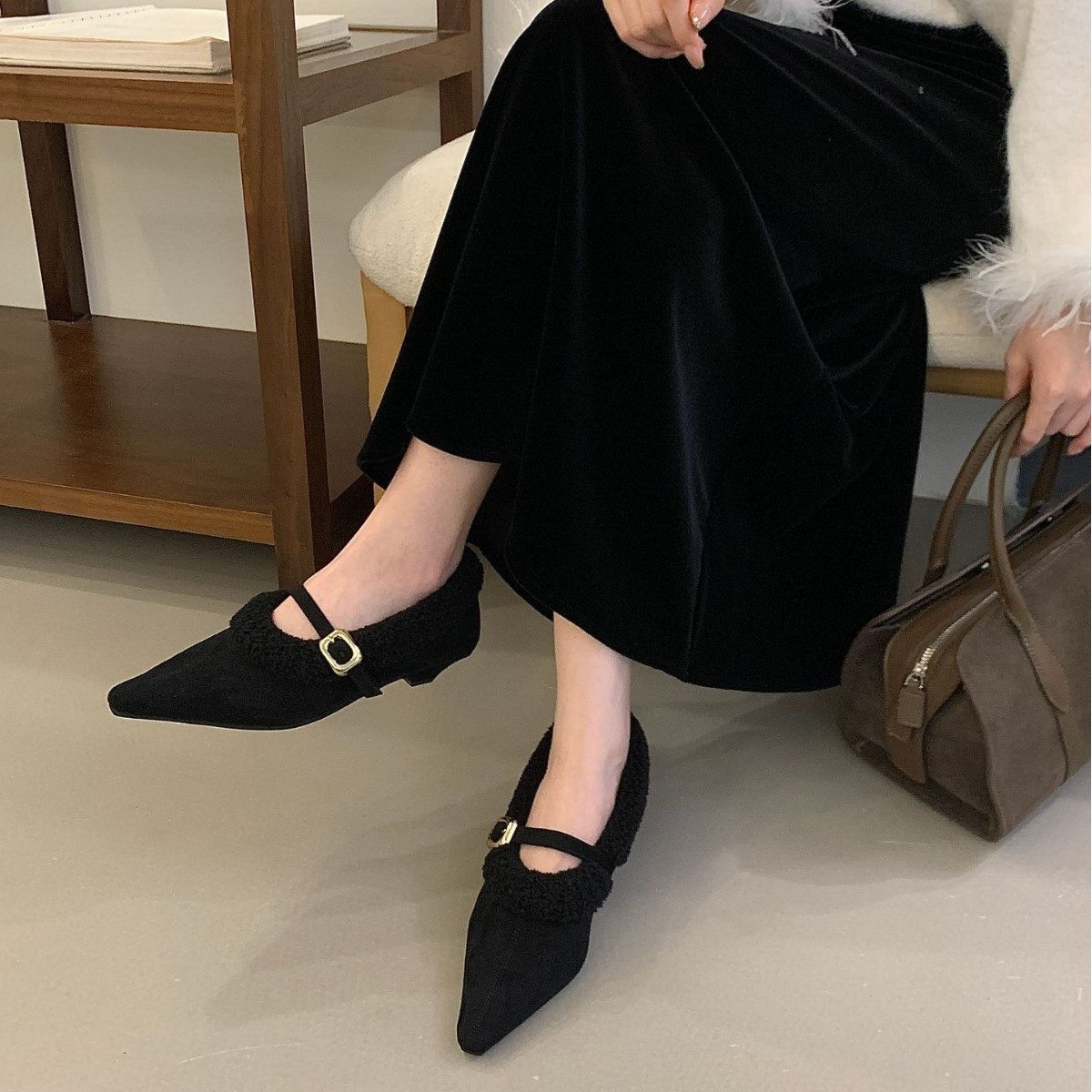 气质百搭2025秋冬新款小粗跟一字绊带日常通勤绒面休闲毛毛保暖鞋