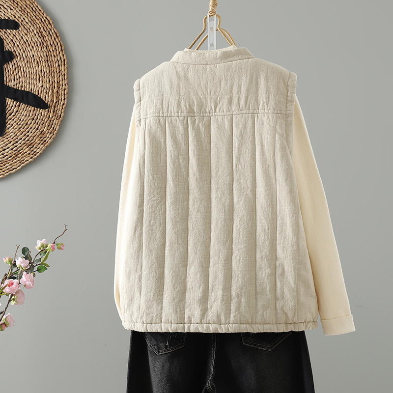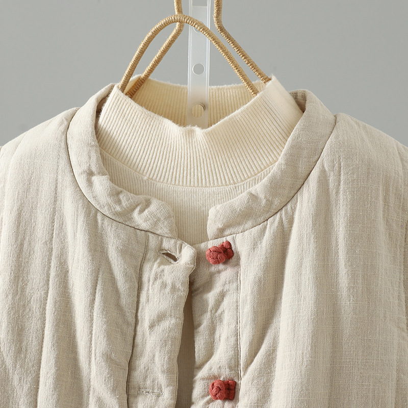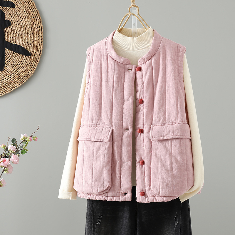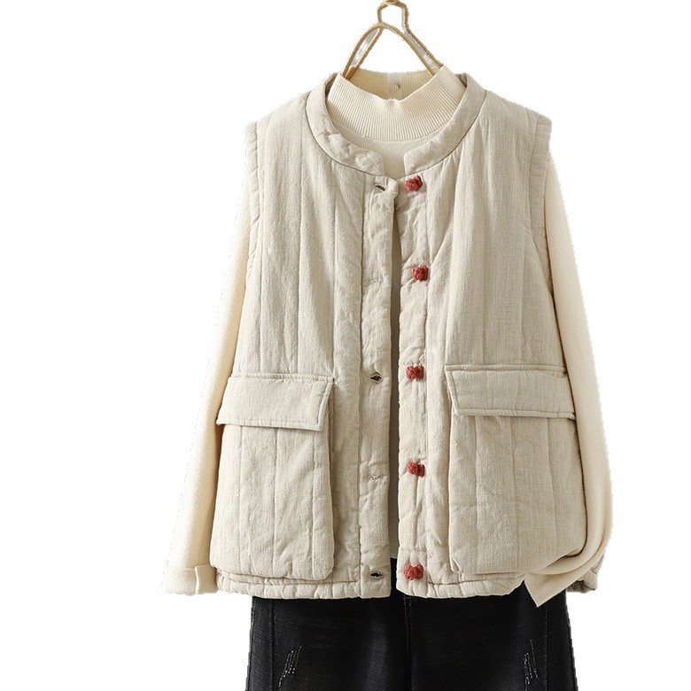 2025冬季新款文艺复古棉麻棉服女纯色圆领夹棉短款宽松棉衣马甲