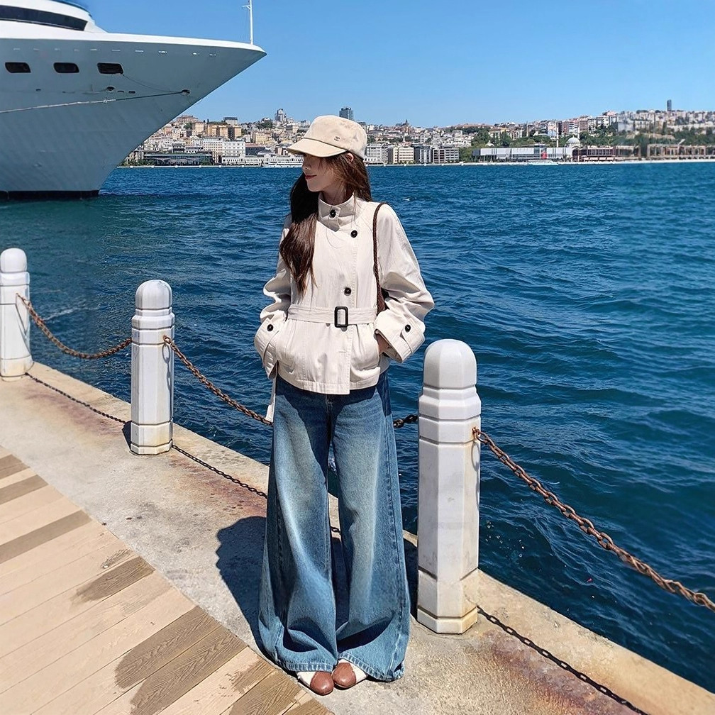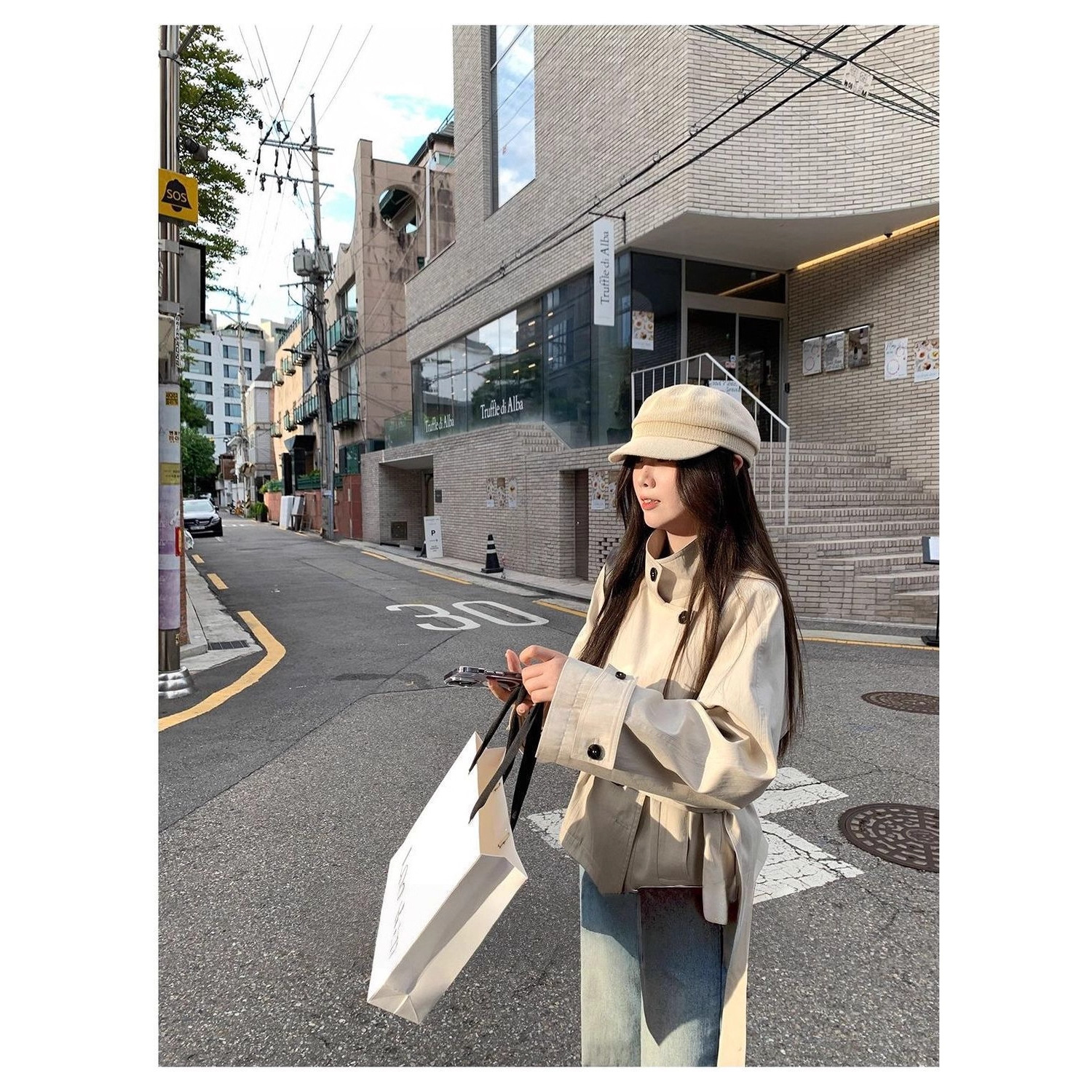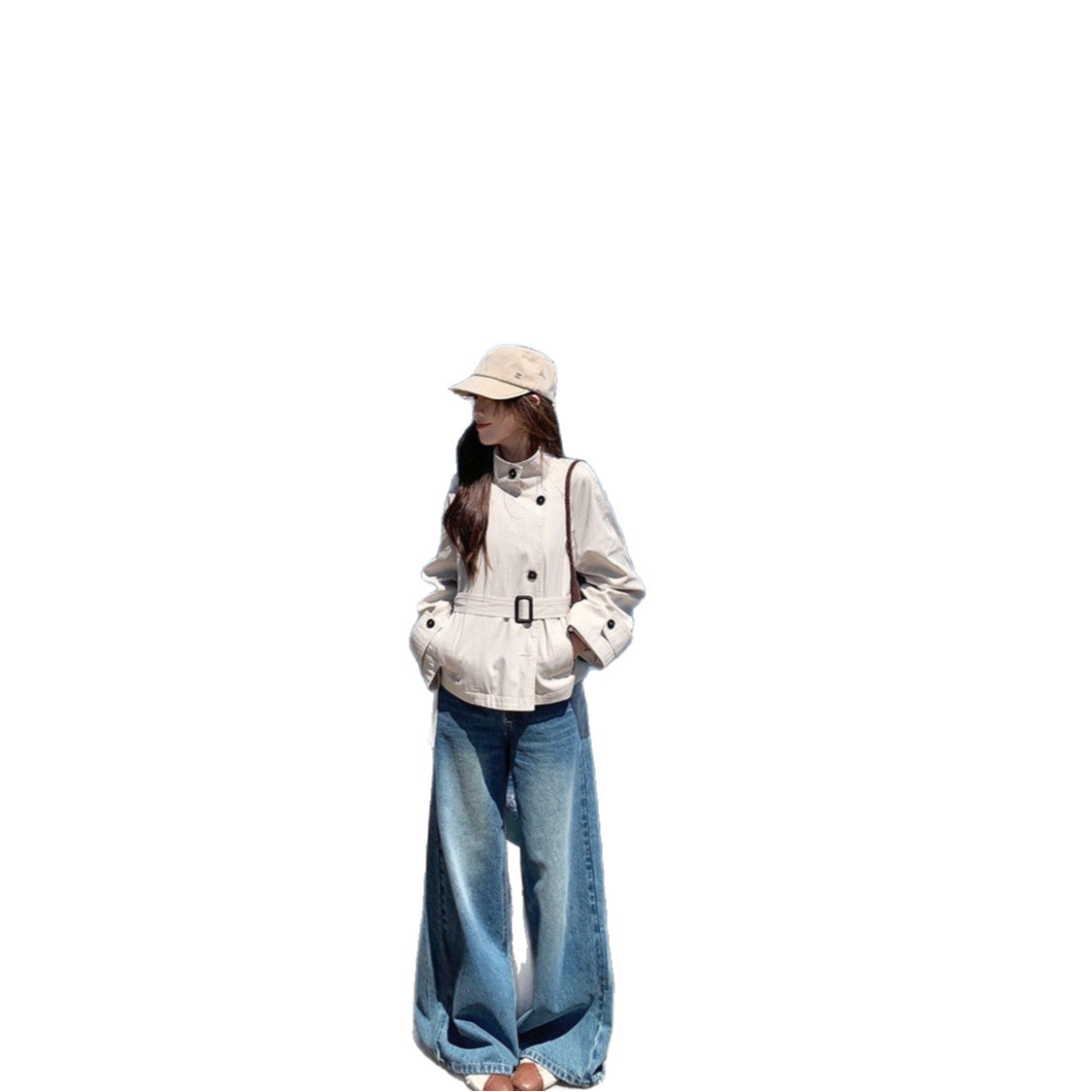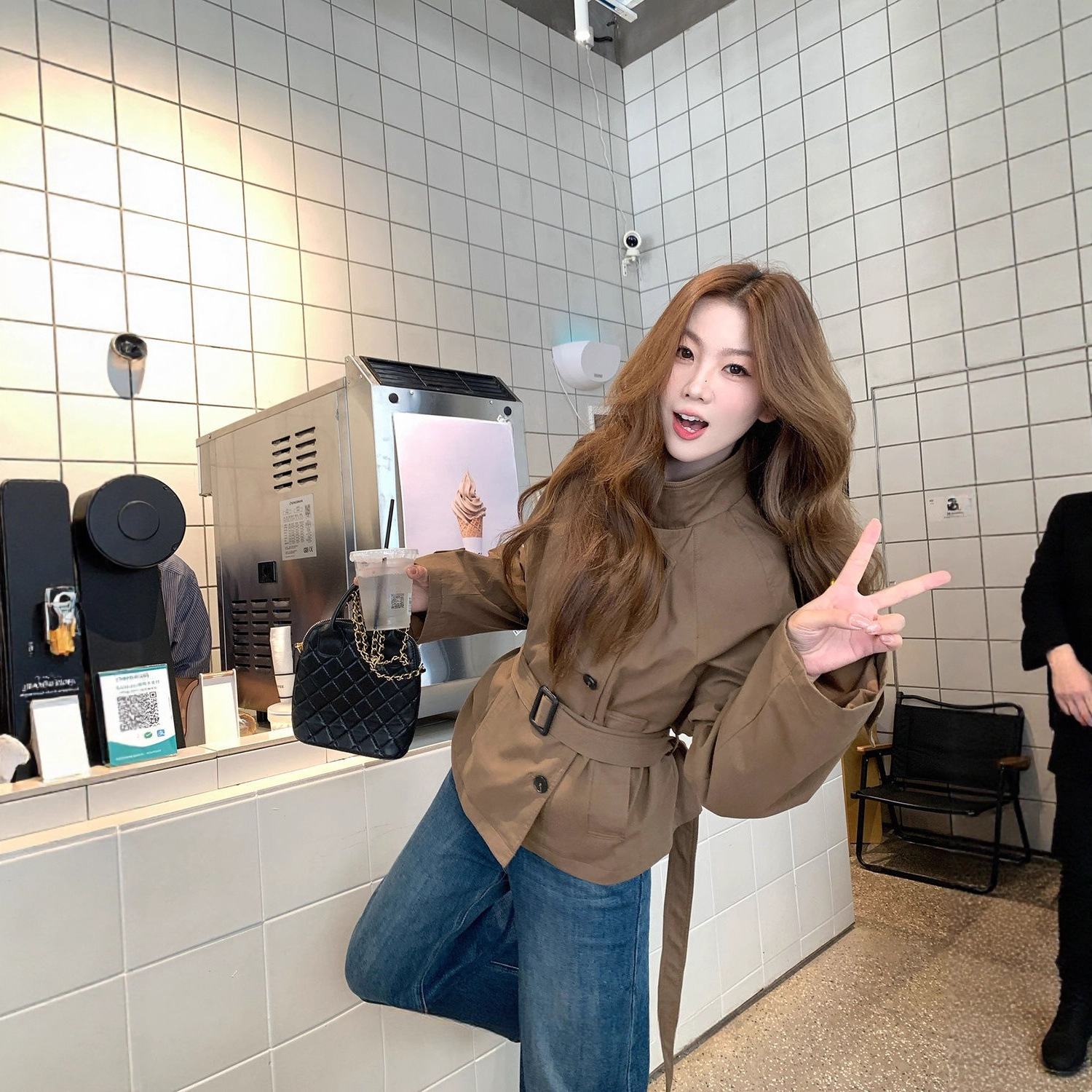 韩系短款风衣外套女英伦风立领收腰外套卡其深咖米 白雪尼尔氨纶