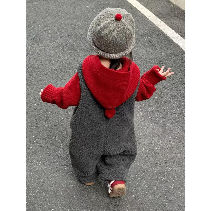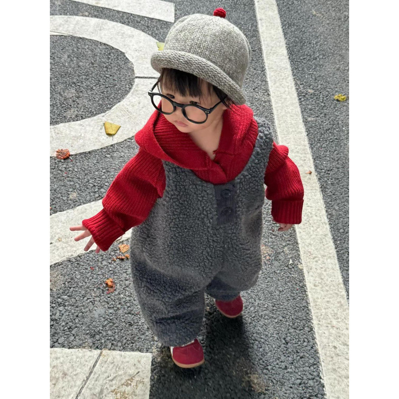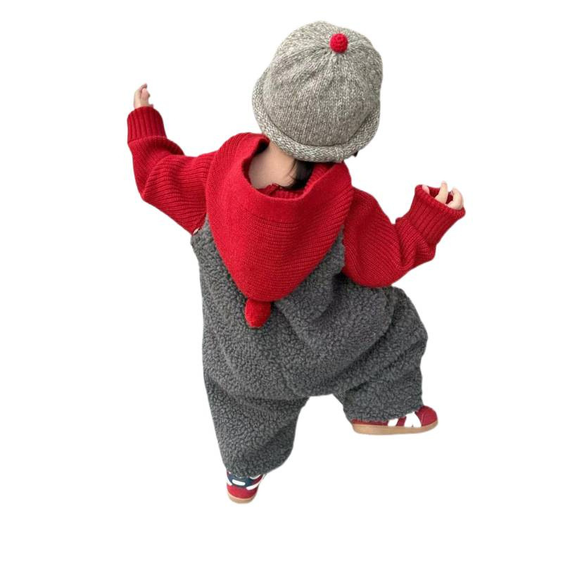 | 颜色 | 套装(灰色背带裤+红色连帽毛衣) | 颜色 | 灰色羊羔绒背带裤 (夹棉) |